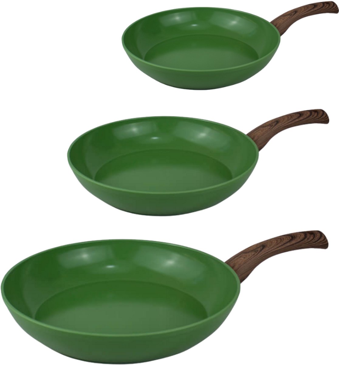 De Go Green 3-delige koekenpannenset is een compacte set van drie koekenpannen (20, 24 en 28 cm) ontworpen voor dagelijks gebruik in een huishouden. De pannen hebben een keramische, PFAS-vrije antiaanbaklaag en worden gepresenteerd als geschikt voor alle warmtebronnen, inclusief inductie.