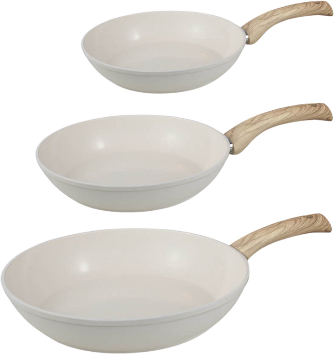 De Go Ivory 3-delige koekenpannenset is een complete set van drie maten (20, 24 en 28 cm) ontworpen voor dagelijks koken. De pannen hebben een crèmekleurig uiterlijk en een keramische antiaanbaklaag die volgens de fabrikant PFAS-vrij is. De set richt zich op huiskoks die een gezondere antiaanbakoptie willen en waarde hechten aan uitstraling en gebruiksgemak in de keuken.