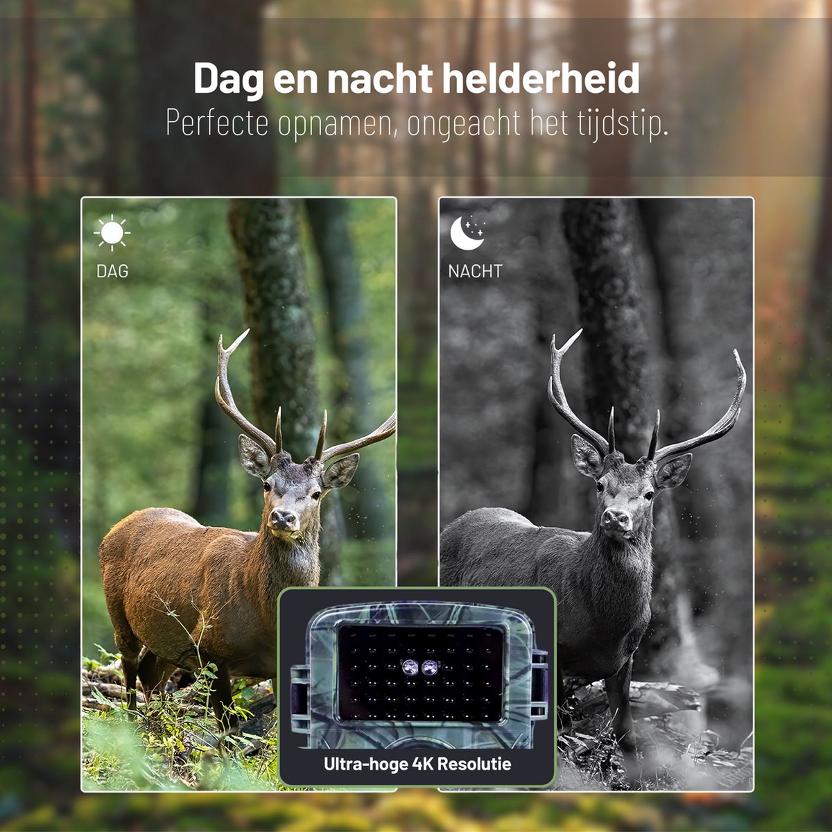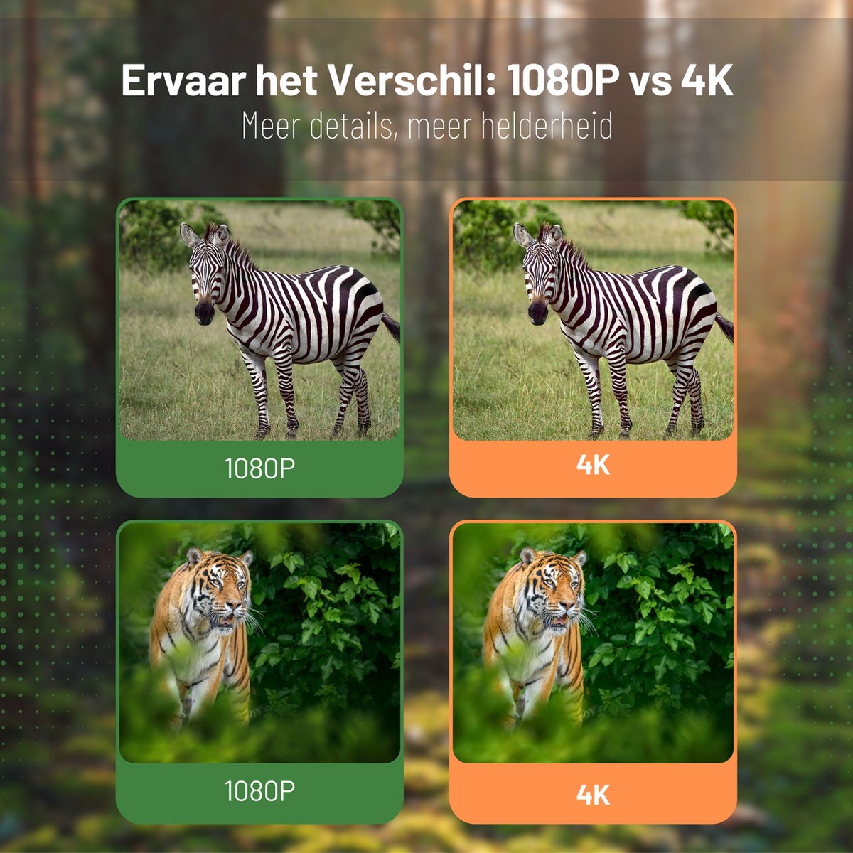 Praktisch: 4K is vooral handig bij daglicht. Bij nacht blijven infraroodbeelden meestal in lagere kleur- of zwart-witresolutie, maar 4K zorgt er overdag voor dat details – takjes, vachttextuur, kleine dieren – zichtbaar blijven.