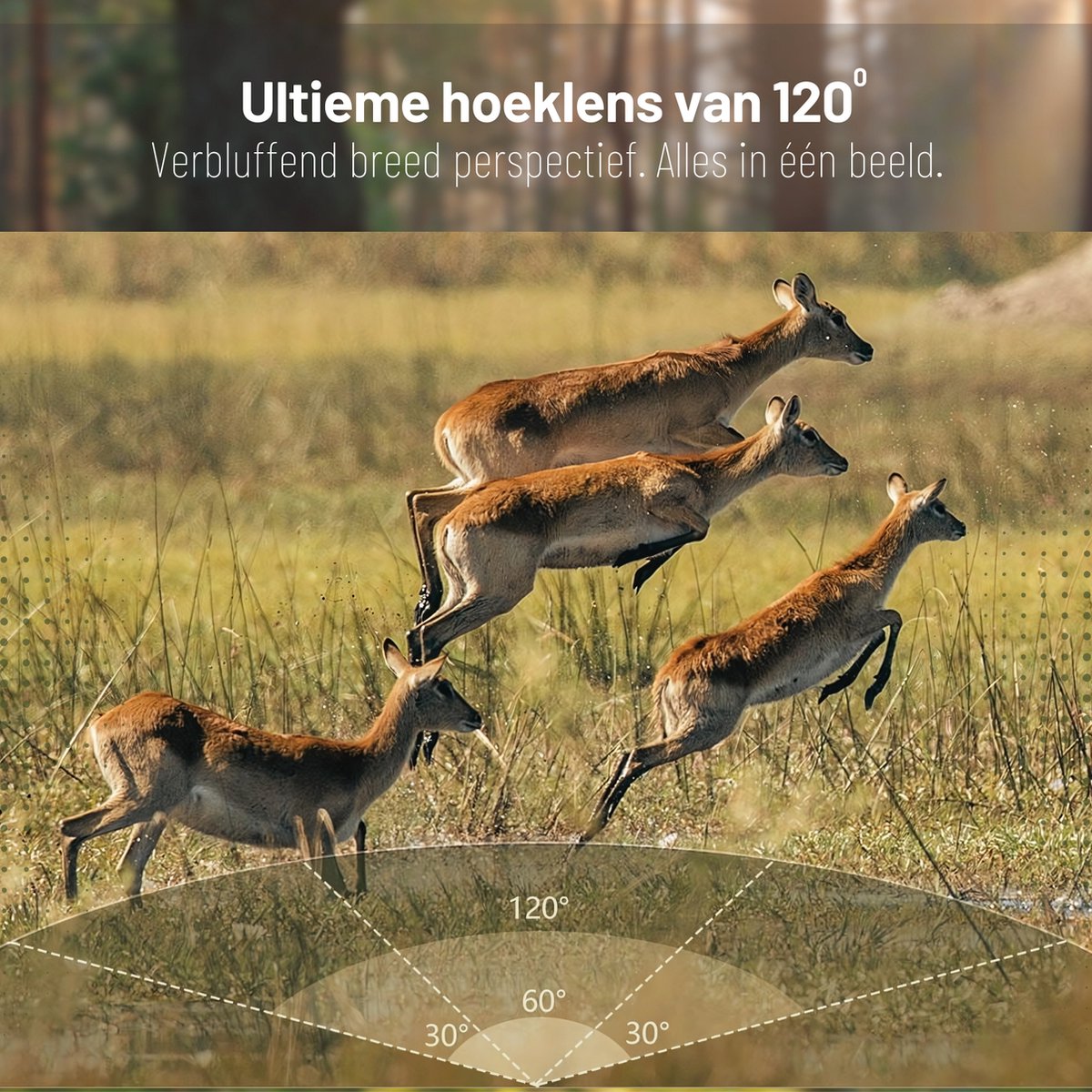 Een lenshoek van 120° vangt een breed gezichtsveld, waardoor je minder snel meerdere camera’s nodig hebt om een open terrein te dekken. Handig op plekken waar dieren in verschillende richtingen passeren of waar je een ruimer overzicht van een voederplek wilt.