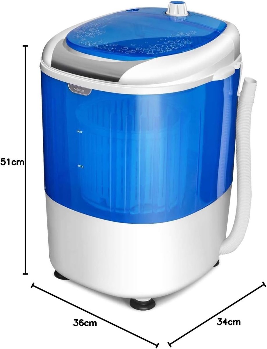 Deze draagbare wasmachine is een compacte, lichtgewicht oplossing voor iedereen die slim met ruimte wil omgaan. Hij is bedoeld voor kleine huishoudens, studio’s, kamers in een studentenhuis, tiny houses, campers en de camping. Dankzij de automatische spoelcyclus, eenvoudige bediening met tijdklok en meegeleverde afvoerslang kun je snel een kleine was opfrissen zonder een grote, vaste machine nodig te hebben.