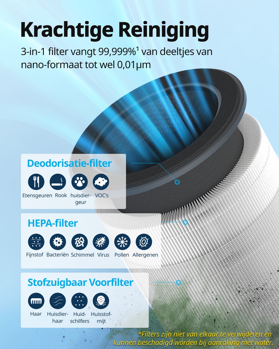 Filtratieprestaties | Verwijdert 99,999% van deeltjes tot 0,01 micron; reduceert 99% VOS/geuren (bron: listing, gecontroleerd 2024) |