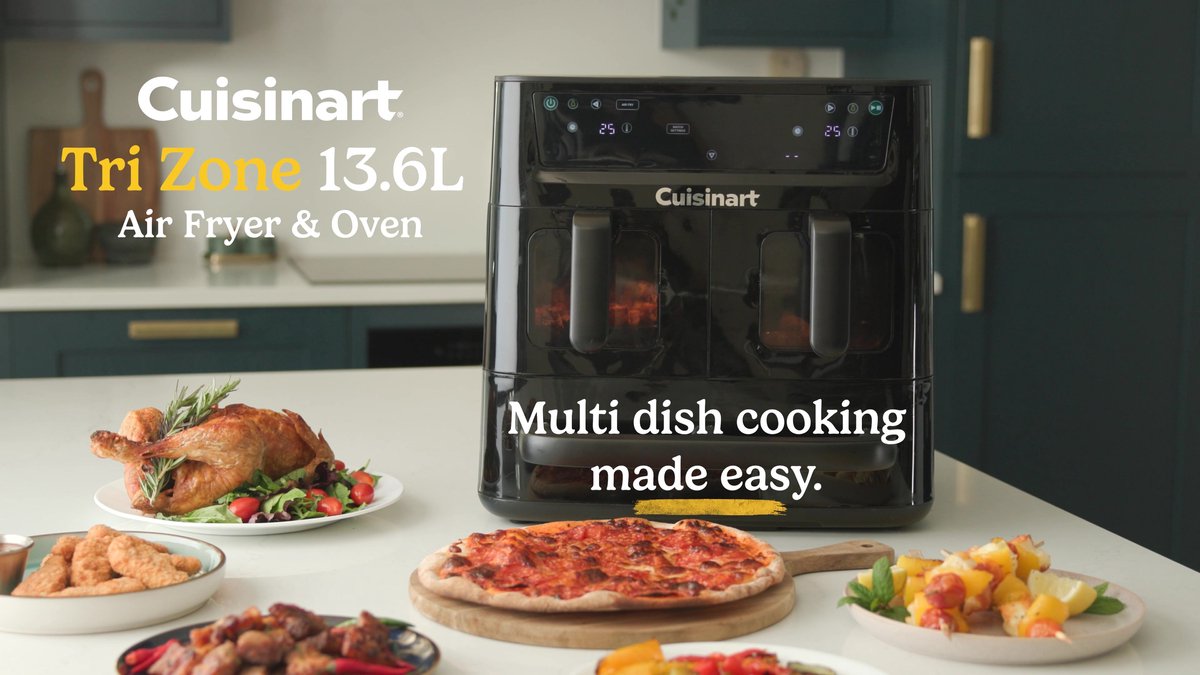 De Cuisinart Tri Zone AFT13XBLE Airfryer & Oven is een veelzijdige heteluchtoven met drie volledig onafhankelijke kookzones: twee manden van 4,3 liter en een ovenlade van 5 liter, goed voor een totale inhoud van 13,6 liter. Hij is bedoeld voor wie snel en flexibel meerdere gerechten tegelijk wil bereiden, van gezinnen met drukke schema’s tot hobbykoks die graag een complete maaltijd in één keer op tafel zetten.