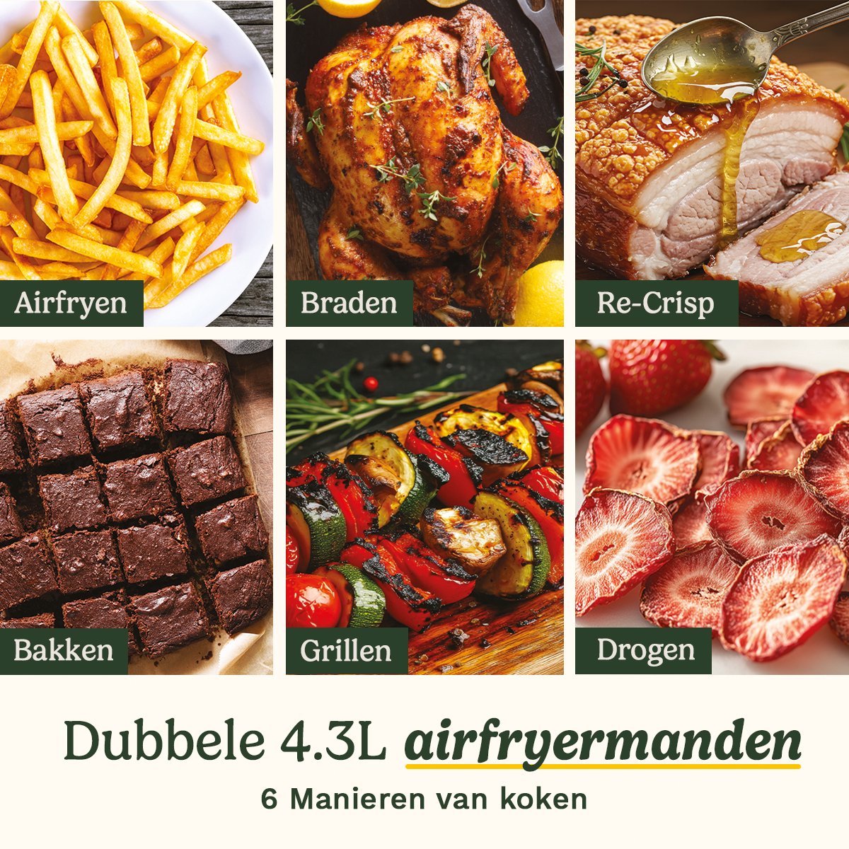 - Temperatuurkeuze: gebruik bij voorkeur de lade voor bereidingen die het best op hoge temperatuur garen (tot 230°C). De manden zijn ideaal voor snacks, groenten en porties die 160–210°C vragen.