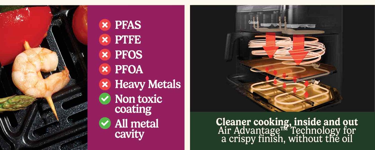 Dankzij 9 automatische programma’s, kooksynchronisatie en een PFAS-vrije keramische antiaanbaklaag combineert dit toestel snelheid met gemak én schoner koken. Volgens de productinformatie levert de krachtige luchtstroom knapperige resultaten met weinig tot geen olie, terwijl de volledig metalen binnenruimte en vaatwasserbestendige onderdelen het onderhoud vereenvoudigen.