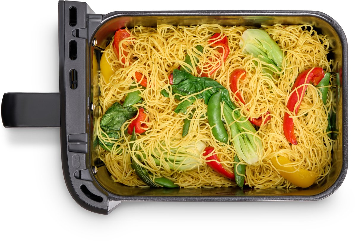 Door de royale capaciteit moet je rekenen op een toestel dat de nodige plaats inneemt op het aanrecht. Voor gezinnen of fanatieke meal-preppers is dat een logische ruil: je krijgt er de luxe van drie gelijktijdige kookzones voor terug. Handgrepen aan manden en lade zijn ergonomisch vormgegeven voor een stevige grip, wat prettig is wanneer je tussentijds schudt of voedsel keert. De bediening is overzichtelijk en logisch, met voorgeprogrammeerde functies en handmatige opties.