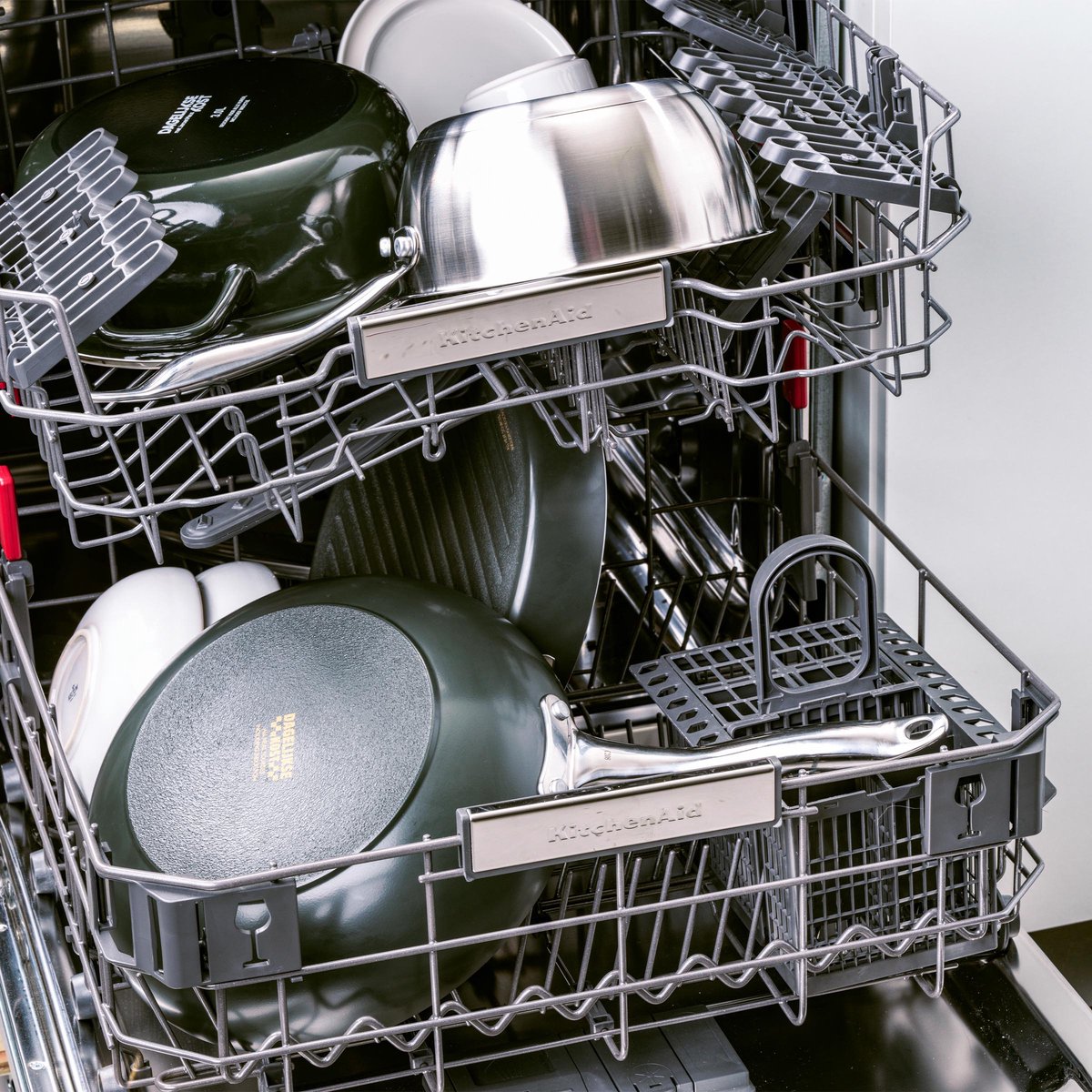 Toch kan de pan in de vaatwasser. Dat is handig wanneer je na een drukke dag alles in één keer wil laten draaien. Als je maximaal lange levensduur wil, is de handwas met lauw water en mild afwasmiddel de beste keuze – zo blijft de laag mooi en behoudt de pan zijn prestaties.