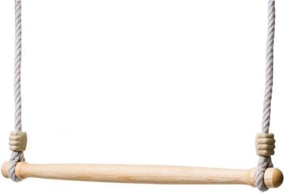 De trapezebalk is gemaakt van essen, een houtsoort die bekendstaat om zijn taaiheid en elasticiteit. Dat maakt het materiaal geschikt voor een trapeze omdat het minder snel breekt of splijt onder wisselende belastingen. Het hout is behandeld met lijnzaadolie, wat twee eigenschappen combineert: bescherming tegen vocht en een afgewerkte, warme look die prettig aanvoelt voor blote handen.