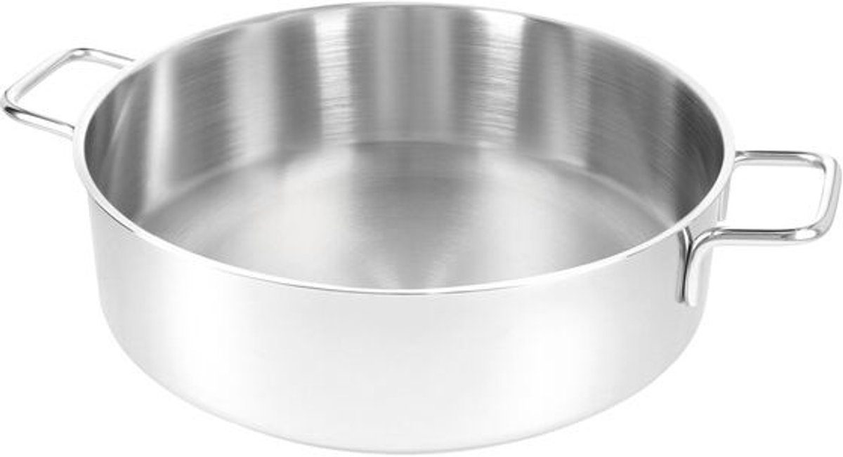 Hoewel deze pan uitblinkt op inductie, werkt hij net zo goed op gas, elektrisch of keramisch. De dikke bodem egaliseert vlammen en warmtebronnen, waardoor je geen verbrande plekken krijgt. Wel is het op gas verstandig de vlam niet langs de zijkant te laten oplaaien; houd de vlam binnen de bodemdiameter om de grepen koel te houden en de Silvinox glans te beschermen.