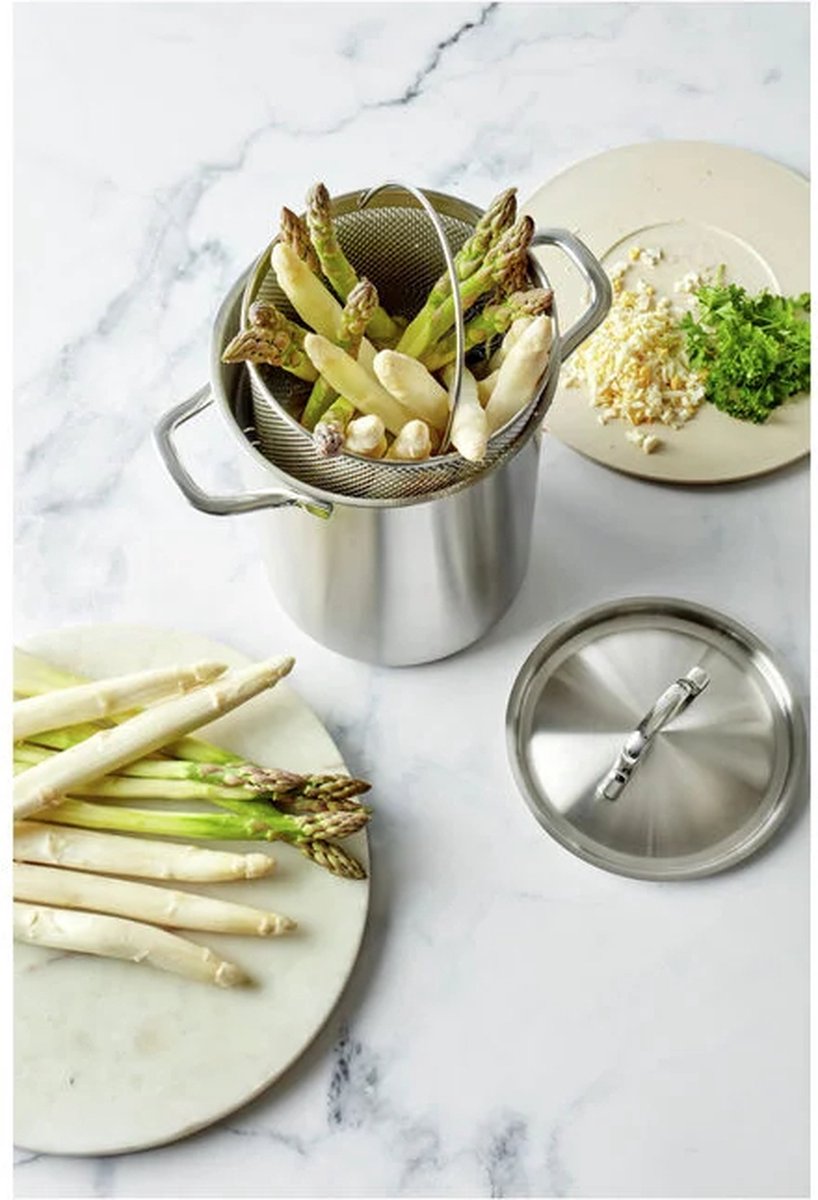 Het meegeleverde inzetmandje maakt het makkelijk om asperges of pasta in één beweging in en uit het kookwater te halen. Het lekhaakje houdt het mandje even uit het water waardoor overtollig kookvocht wegloopt zonder knoeien.