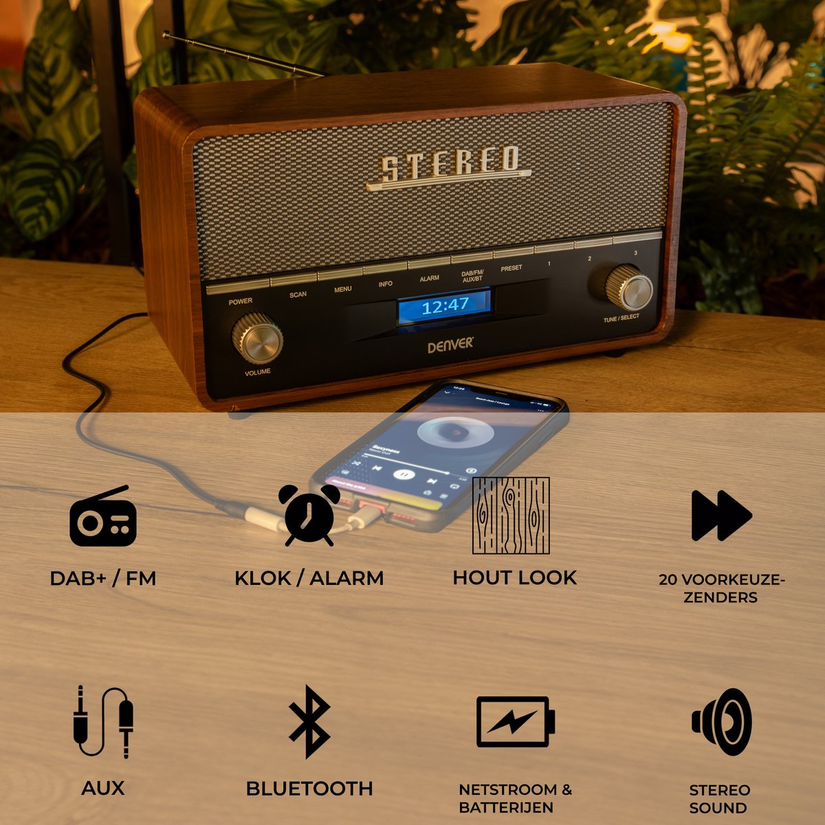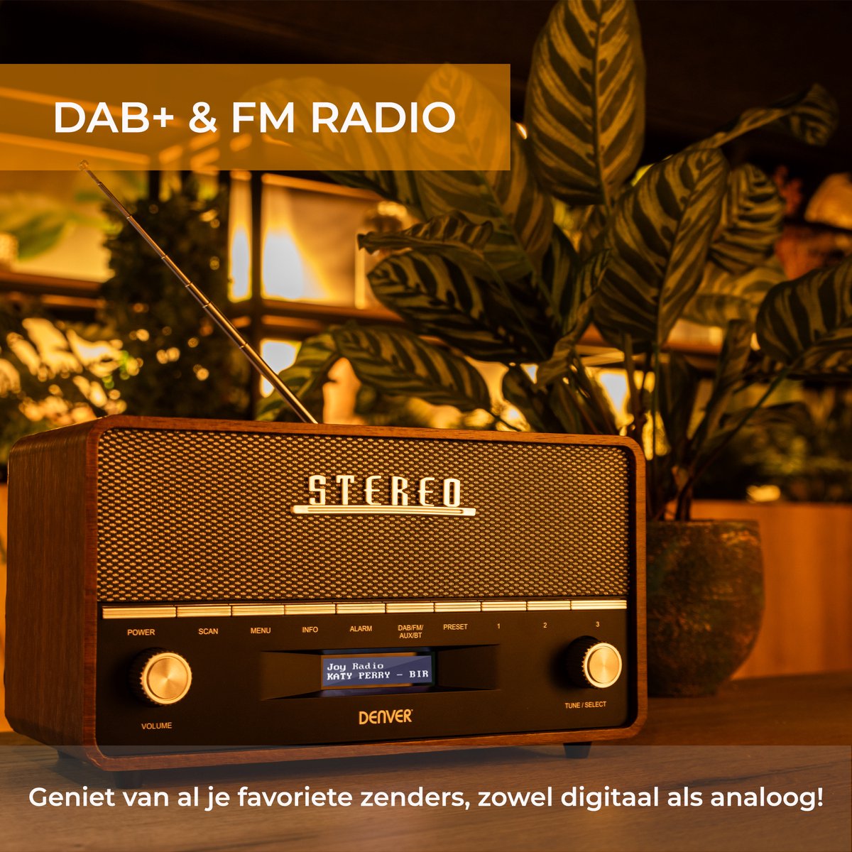 Overzicht:De Denver DAB36 is een trendy retro DAB radio, ideaal voor Nederlandse luisteraars die zuiver geluid en moderne connectiviteit willen. Deze radio biedt meerdere afspeelmogelijkheden en levert een 2 x 50W uitgang voor krachtige stereoweergave.