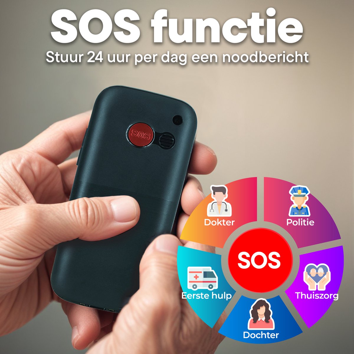 - Mensen die extra zekerheid willen dankzij een fysieke SOS-knop en vooraf ingestelde noodnummers.