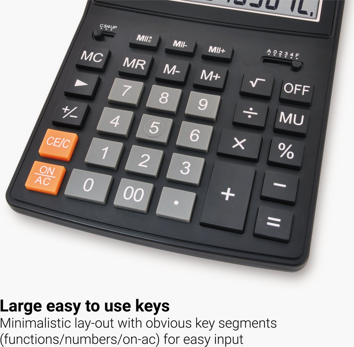 Overzicht:Deze zware rekenmachine is een robuuste, extra grote desktopoplossing, ideaal voor Nederlandse winkels en zakelijke gebruikssituaties. Met afmetingen 205x155x40 mm biedt hij een schuin geplaatst lcd‑scherm, dubbel geheugen en een MU-winstfunctie voor snelle margeberekeningen.