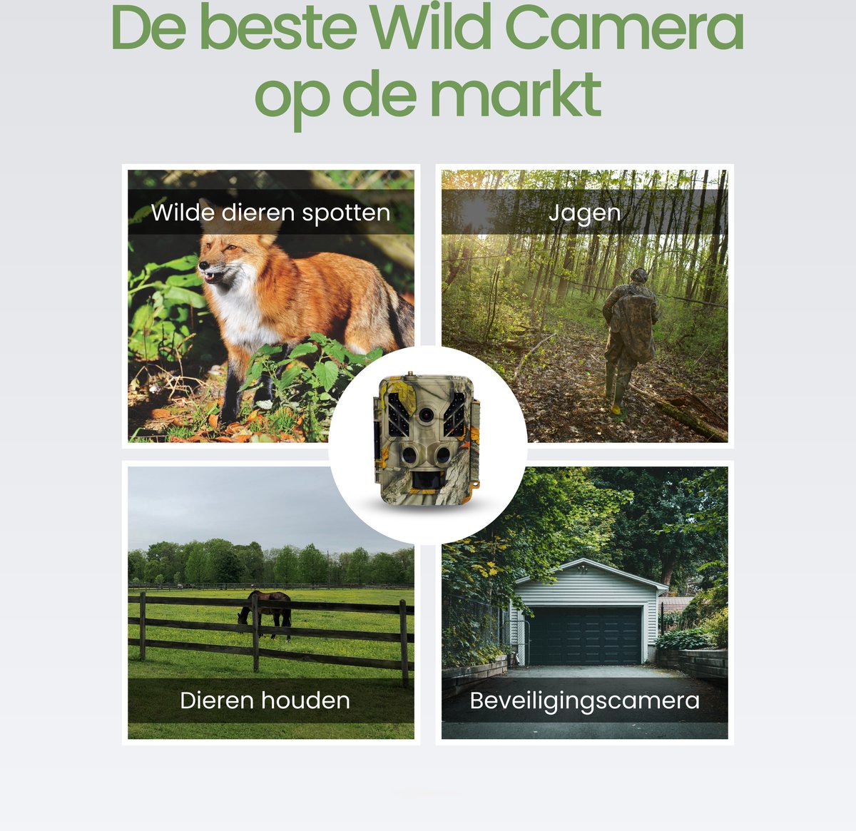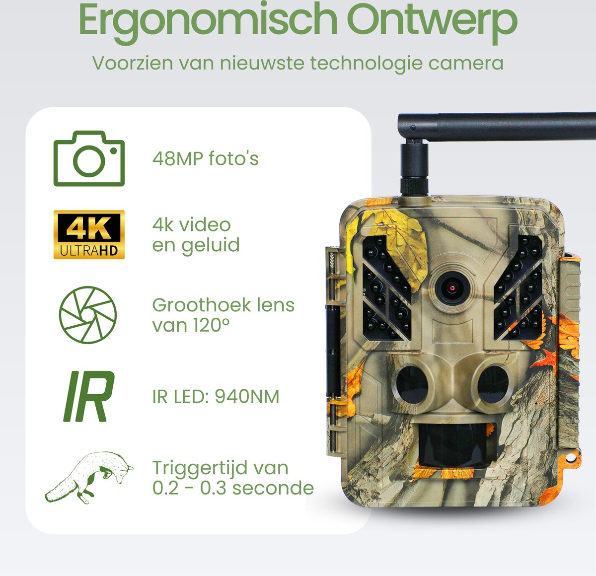Deze wildcamera is een compacte buitencamera die is bedoeld voor natuurliefhebbers, jagers en iedereen die dieren of een terrein op afstand wil monitoren. Hij combineert hoge resolutie foto- en video-opnamen met een eigen wifi-verbinding, nachtzicht en een robuuste, waterdichte behuizing.