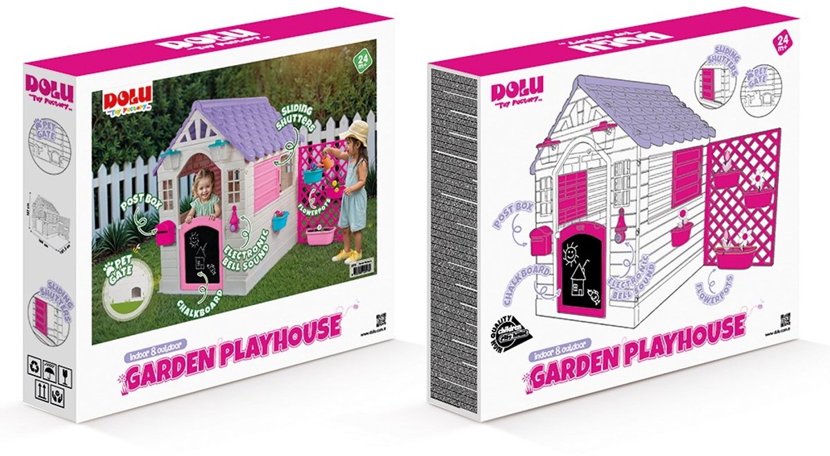 Het Dolu Garden Speelhuisje is een klein, kunststof speelhuisje in wit en roze dat kinderen een eigen plekje biedt om te spelen en fantaseren. Het huisje heeft meerdere accessoires zoals een brievenbus, deurbel, een schutting met plantenbakjes en ramen met luiken; de halvedeur fungeert bovendien als krijtbord.