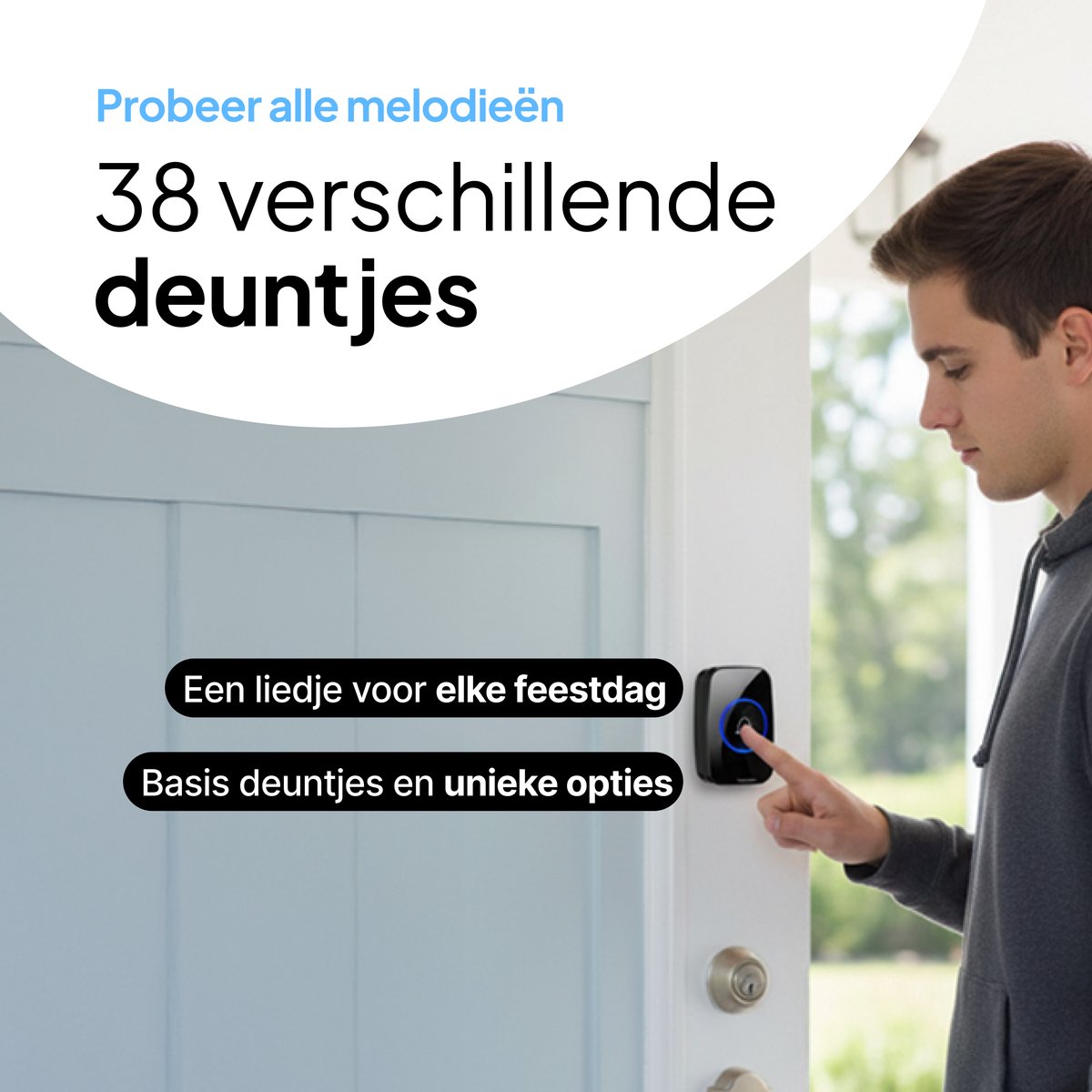 - Geluidskeuze: 38 melodieën betekent dat je altijd wel een klank vindt die je prettig vindt en goed hoort. Wissel af per seizoen of gebeurtenis; je raakt niet snel uitgekeken op het geluid.