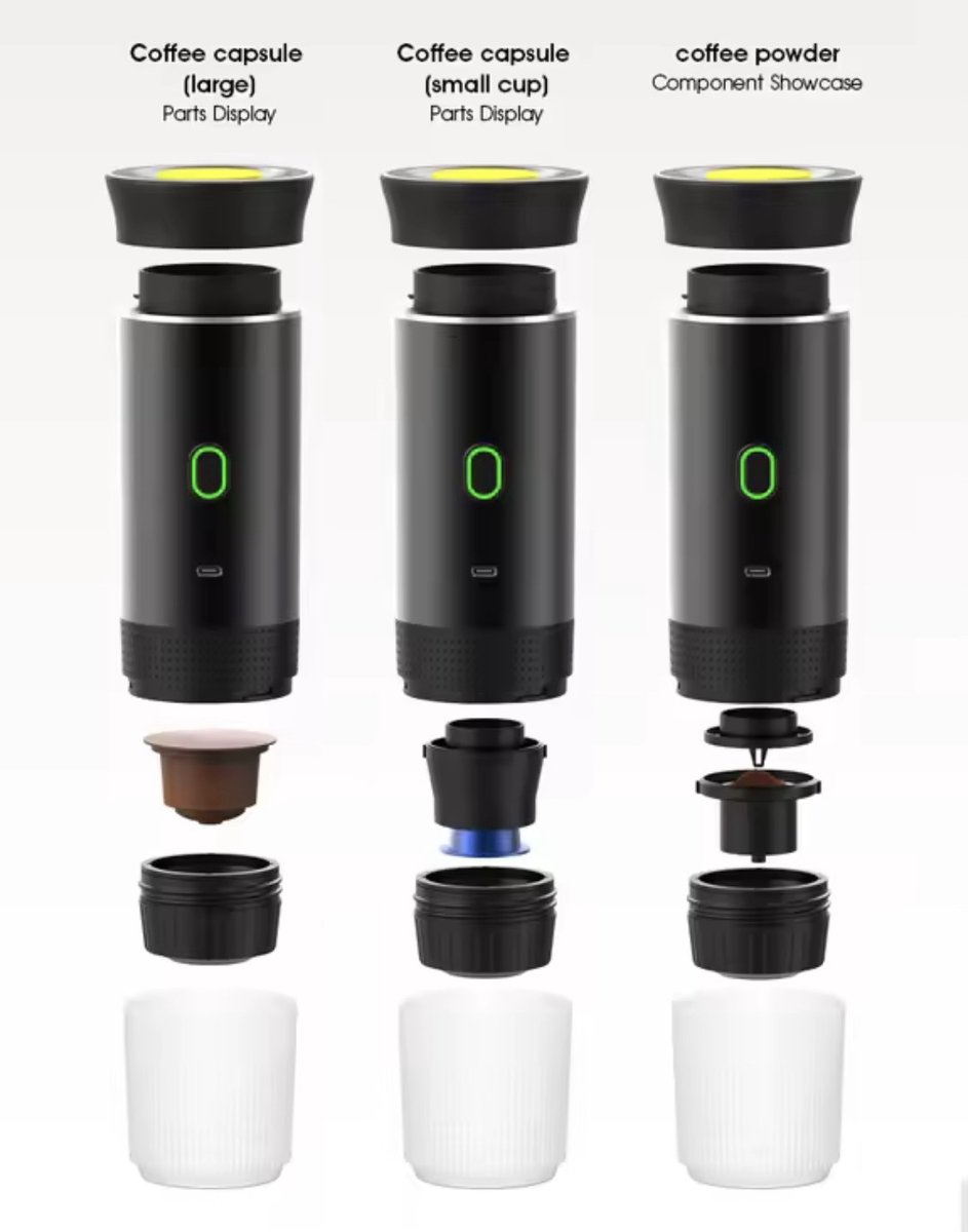De 3-in-1 draagbare espressomachine is een compacte koffiezetter die ontworpen is voor wie regelmatig onderweg een espresso wil zetten. Het apparaat combineert bruikbaarheid voor gemalen koffie en capsules met een op batterij werkende verwarmings- en extractiefunctie, zodat je onderweg een warm of koud kopje kunt bereiden.