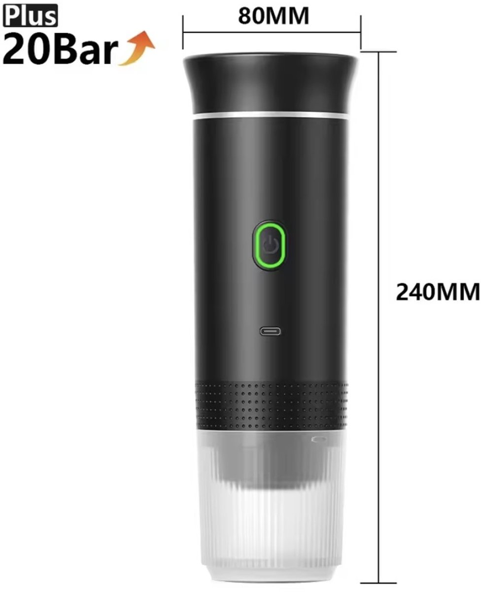 De fabrikant vermeldt geen specifieke materiaalsoorten; materialen zijn daarom: Niet gespecificeerd. Wel zijn afmetingen en draagbaarheid duidelijk: het apparaat meet 83,5 x 245,5 x 83,5 mm en heeft een inhoudscapaciteit van 60 ml. Die compacte footprint maakt de machine geschikt voor opbergvakjes, rugzakken of bekerhouders in auto’s.
