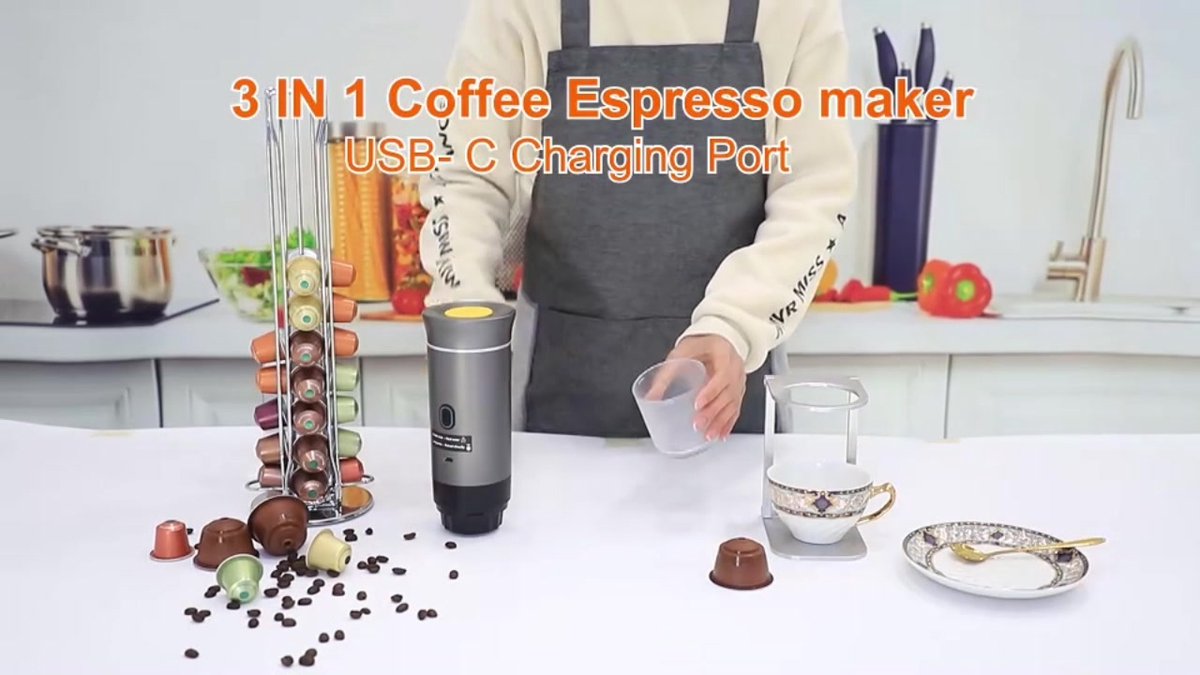 De 3-in-1 draagbare espressomachine is een compact apparaat bedoeld voor koffieliefhebbers die veel onderweg zijn en geen concessies willen doen aan smaak of gemak. Dit apparaat combineert de mogelijkheid om zowel gemalen koffie als capsules te gebruiken met een oplaadbare accu en een compacte vormfactor: ontworpen voor onderweg, op kantoor of tijdens vrije tijd buiten.