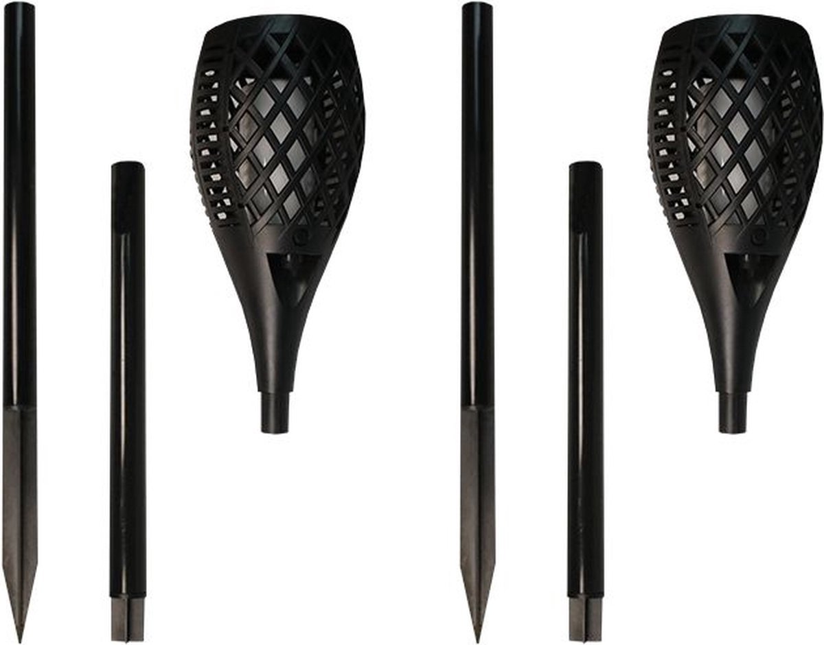 De fakkels zijn gemaakt van ABS en PC met UV‑bescherming. Dat soort kunststof is licht, vormvast en bestand tegen zonlicht, waardoor verkleuring en bros worden op termijn worden beperkt. De behuizing is afgewerkt in zwart met een UV‑coating, wat het uiterlijk strak en neutraal houdt, passend bij verschillende tuinstijlen.