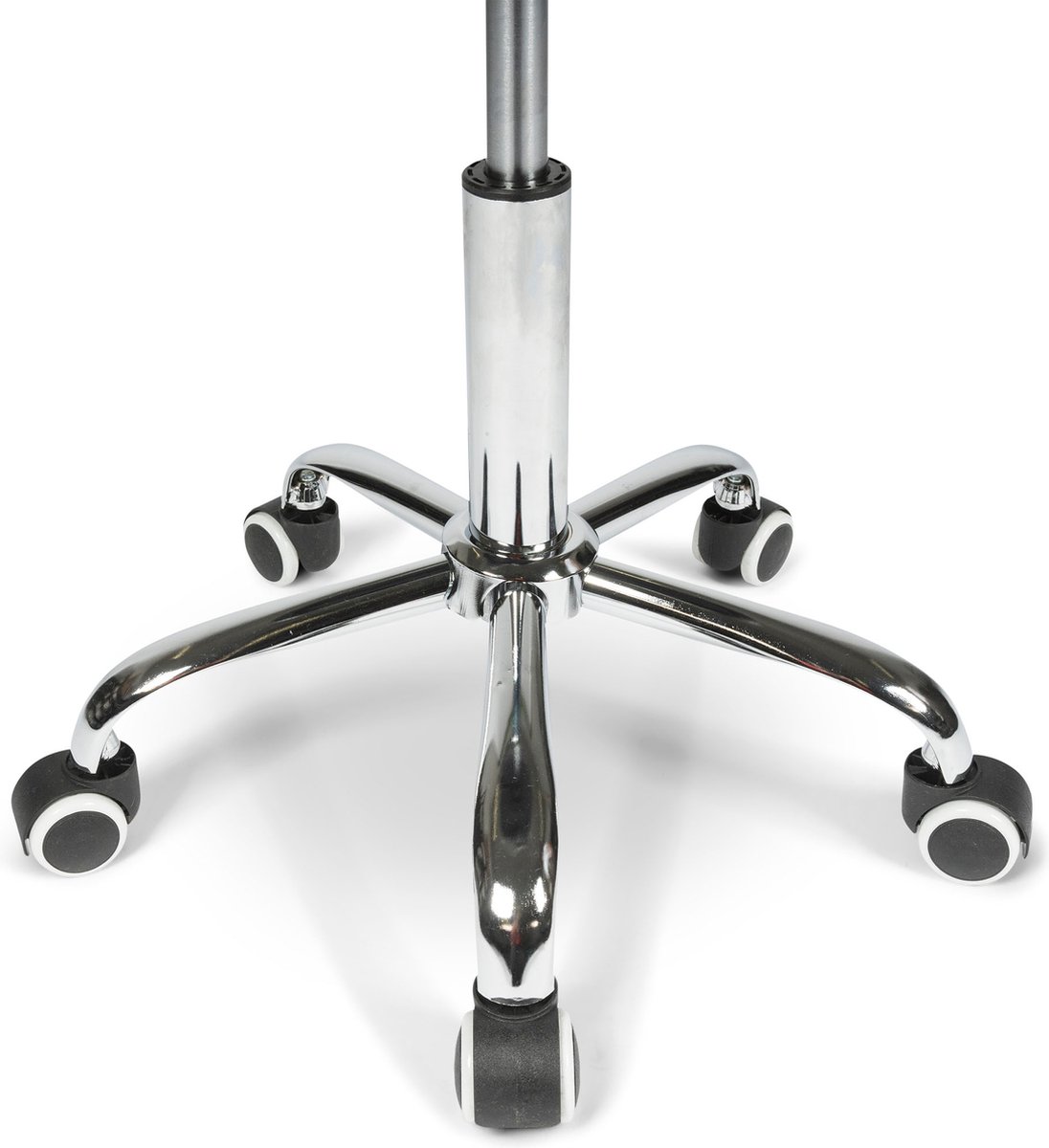Het chromen kruis geeft stabiliteit en is visueel strak. De beschermkap vermindert het risico op krassen op parket of laminaat, wat belangrijk is in praktijken en salons waar de vloer behouden moet blijven. Chroom is bovendien onderhoudsvriendelijk en bestand tegen veelvuldig gebruik.