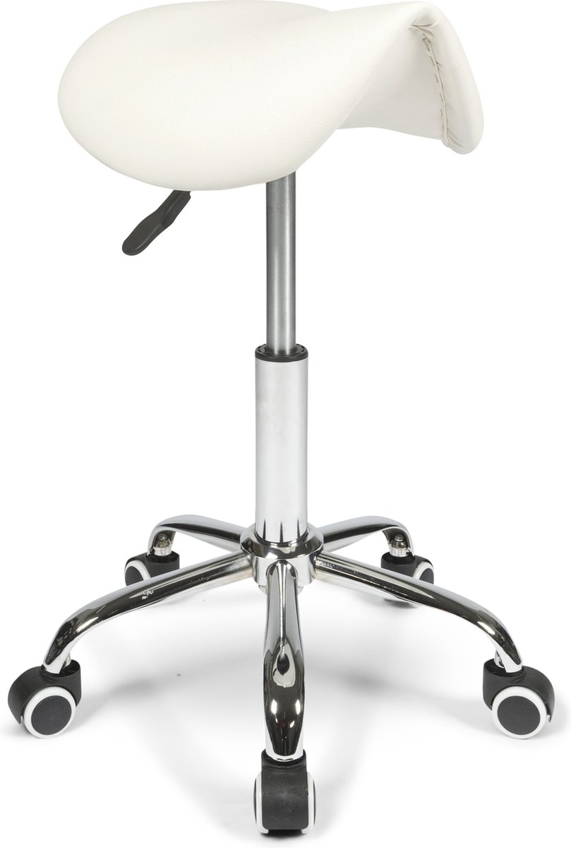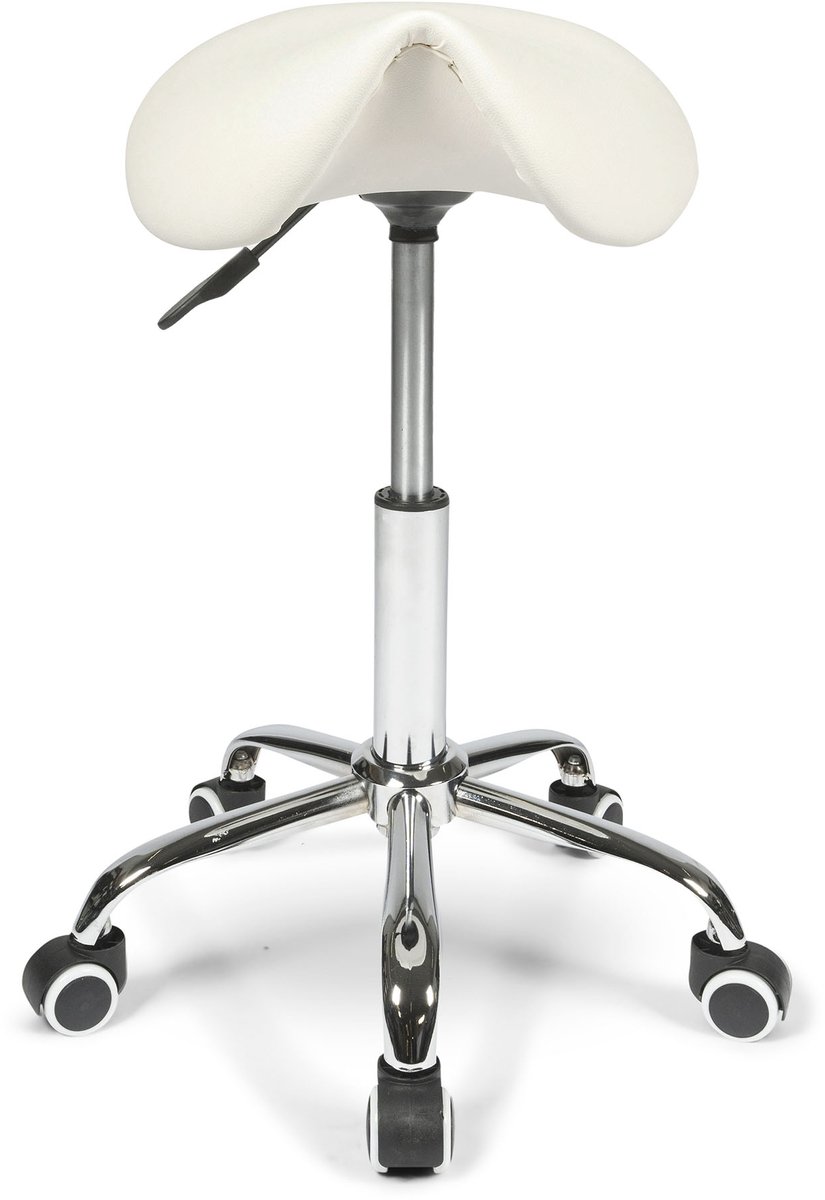 De Dunimed ergonomische zadelkruk is een zadelvormige werkstoel die vooral is bedoeld voor mensen die langdurig of vaak in zittende en halfstaande houdingen werken: denk aan tandartsen, kappers, laboranten, doktersassistentes en medisch personeel. De kruk belooft een open heuphoek en rechtere wervelkolom, met extra mobiliteit door zwenkwielen en een chromen voetkruis.