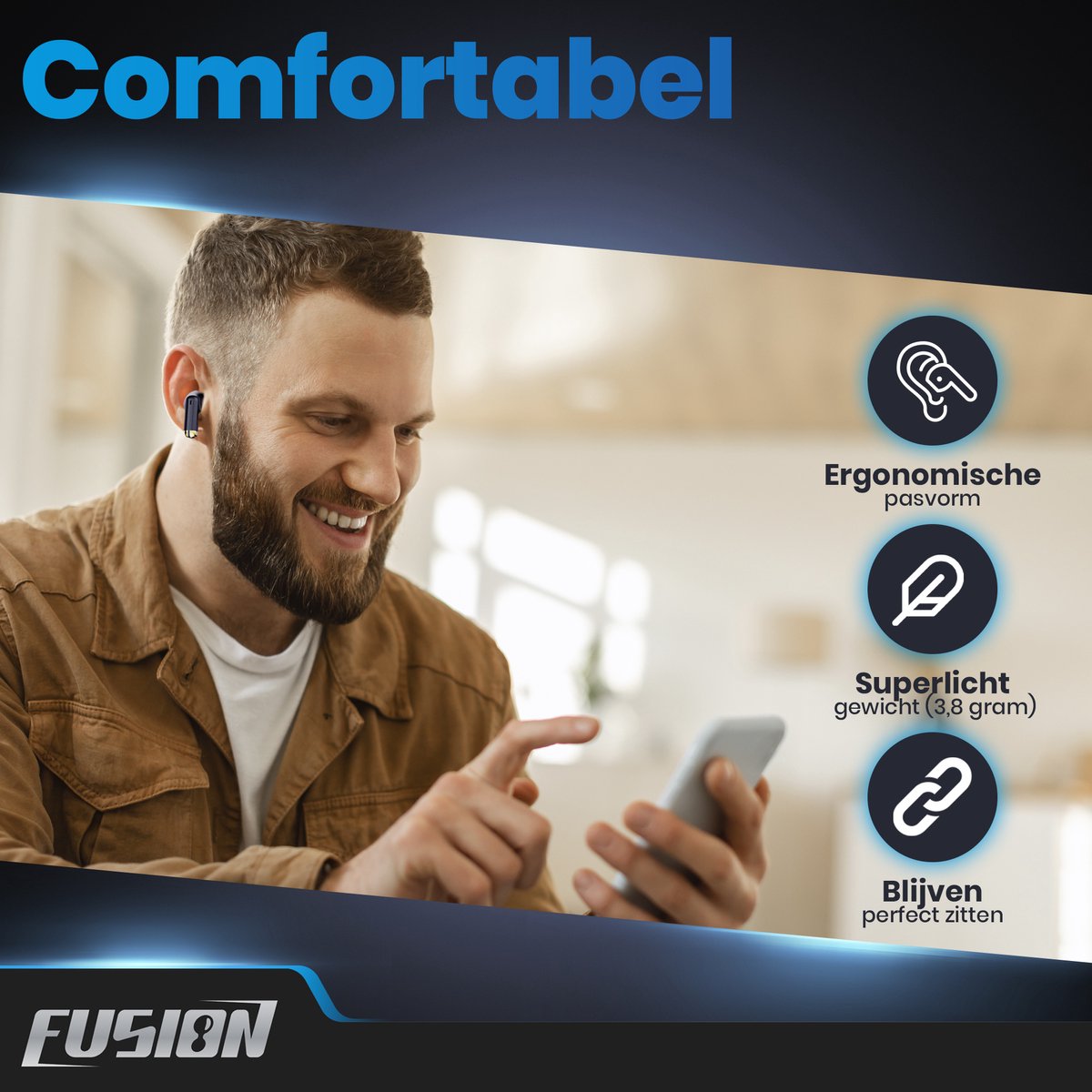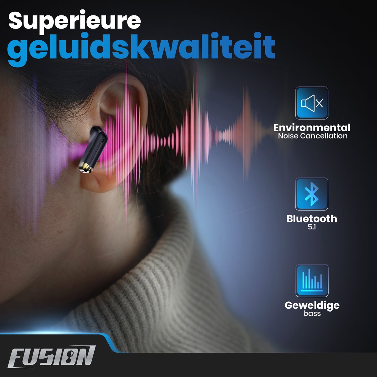De Fusion TWS bluetooth earbuds zijn compacte, volledig draadloze in-ear oordopjes bedoeld voor dagelijks gebruik: muziek luisteren, gamen, podcasts en online vergaderingen. Ze beloven een comfortabele pasvorm, heldere audio en een waterbestendig ontwerp tegen een betaalbare prijs.