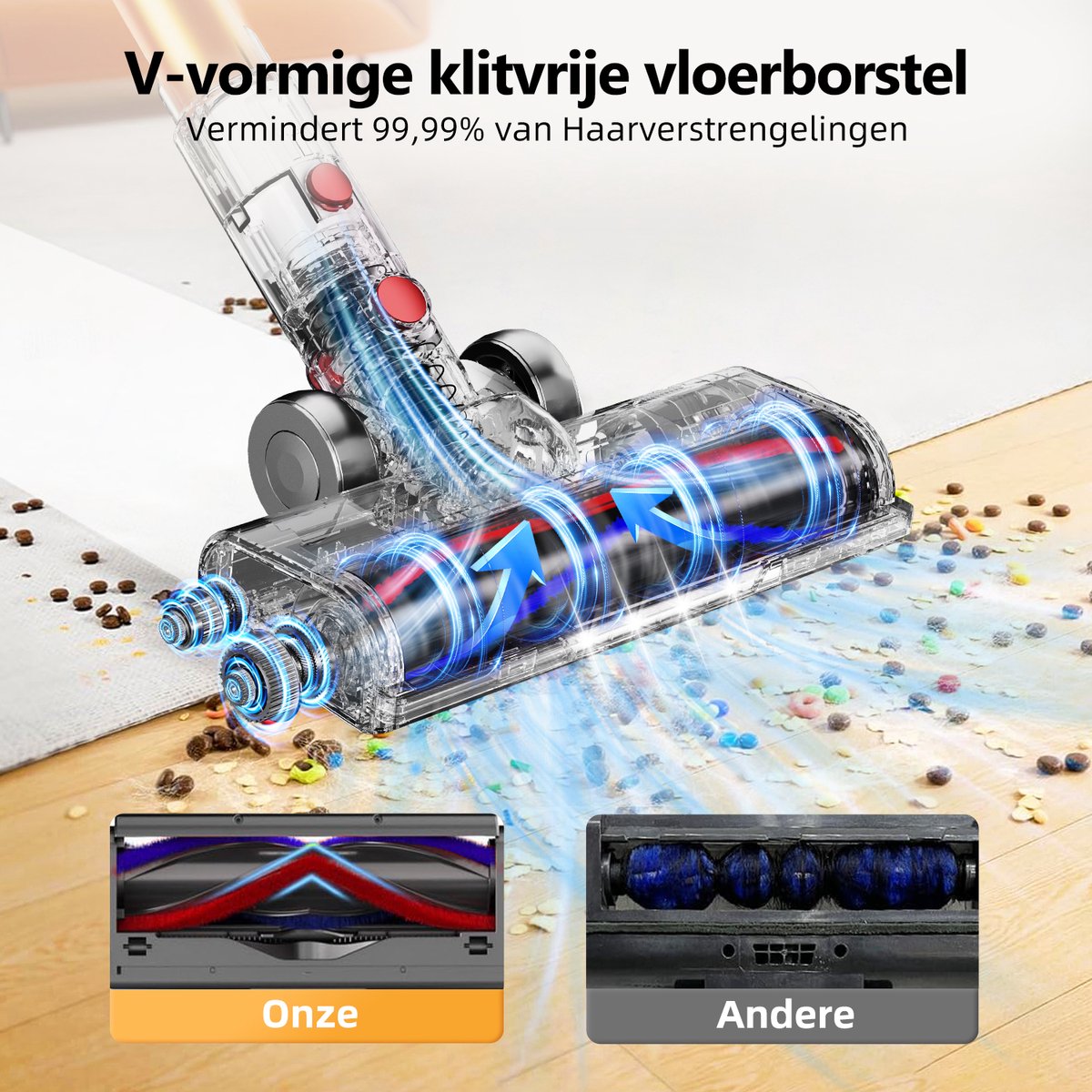 - Voorkom haarverstrikking op tapijt met V‑vormige vloerborstel met verlichting.