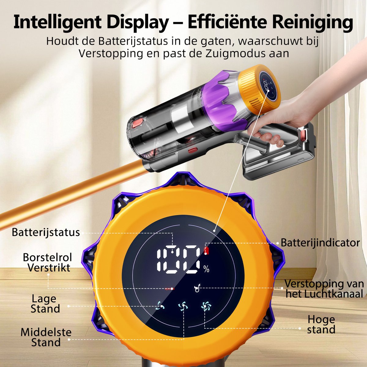 - Je een stille, krachtige steelstofzuiger zoekt die werktijd en status duidelijk toont op een LED-display.