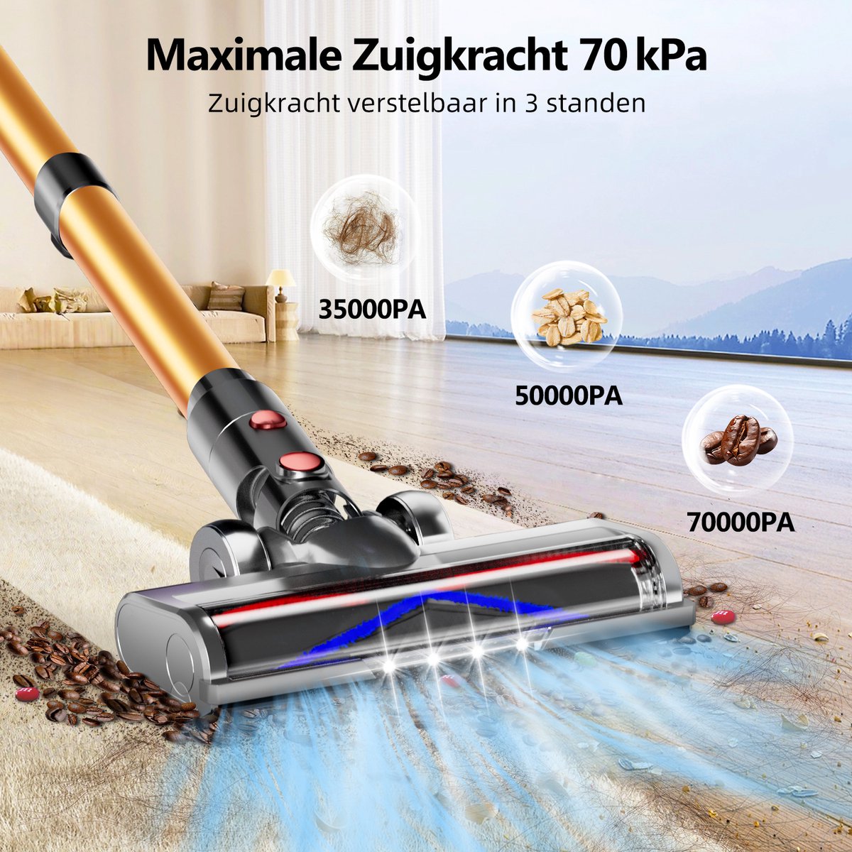 Volgens de fabrikant haalt dit model een maximale zuigkracht tot 70.000 Pa. In de praktijk betekent dat: Eco voor dagelijks stof en kruimels, Normaal voor intensiever vuil en Turbo voor hardnekkige resten of zwaardere deeltjes in kieren en op tapijt. Het is vooral de combinatie van de borstelloze 550W koperen motor en de drie standen die deze kracht goed doseerbaar maken.
