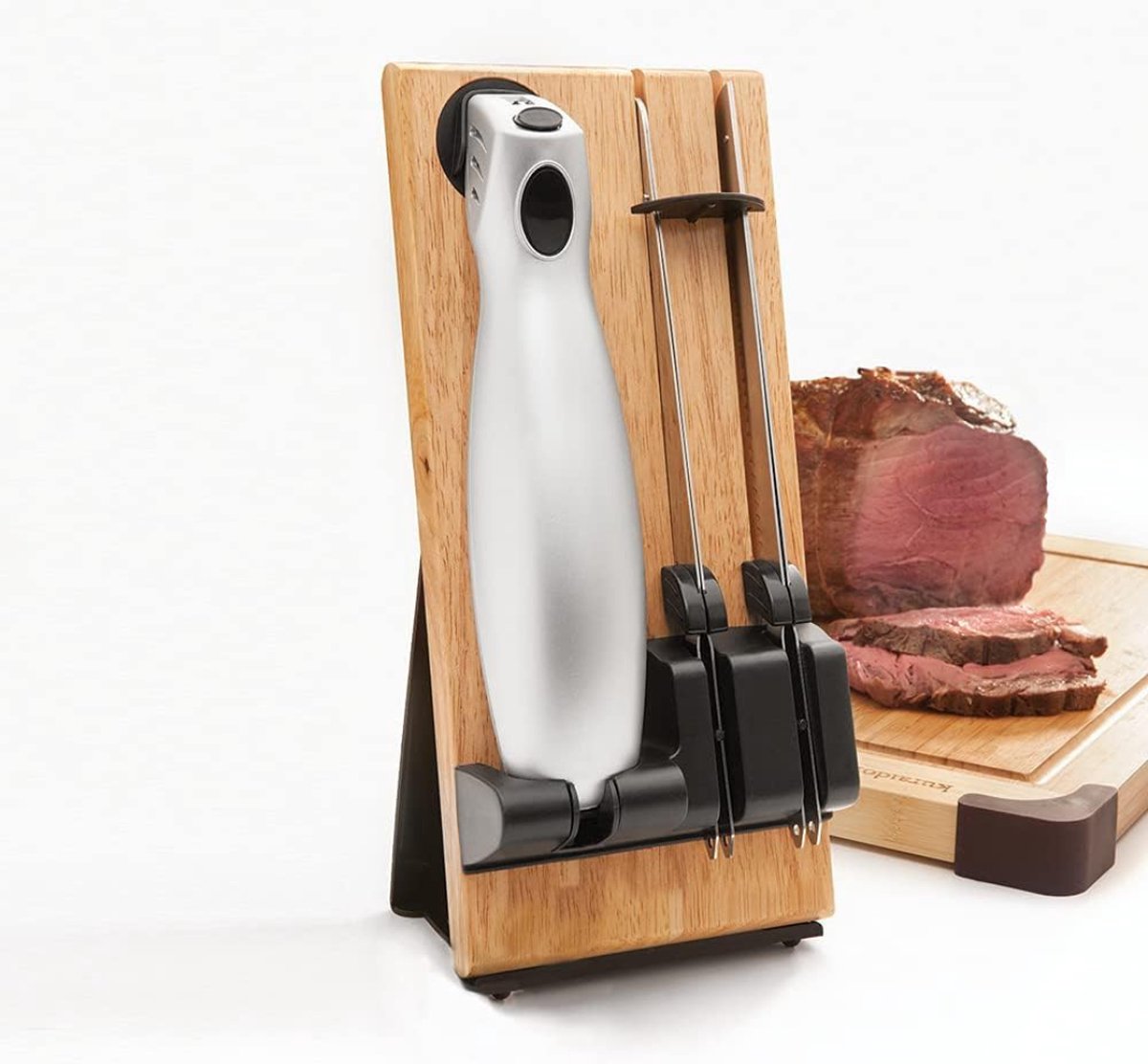 Snel oordeel: een handig en doordacht draadloos elektrisch mes voor alledaagse snijklussen, met twee messensets, een opbergstandaard en een oplaadbare batterij die volgens de fabrikant in 2 uur oplaadt en tot 30 minuten meegaat.