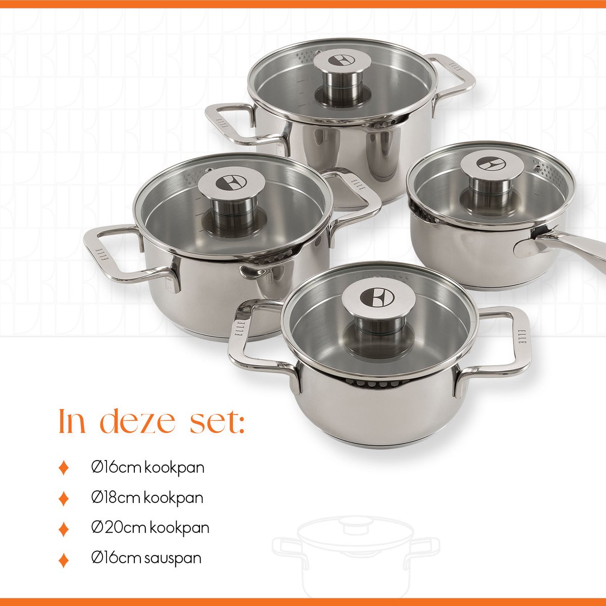 Complete set (4 pannen + deksels = 8-delig) voor veel dagelijkse taken RVS vereist een andere kooktechniek dan anti-aanbak; mogelijk leercurve voor beginners