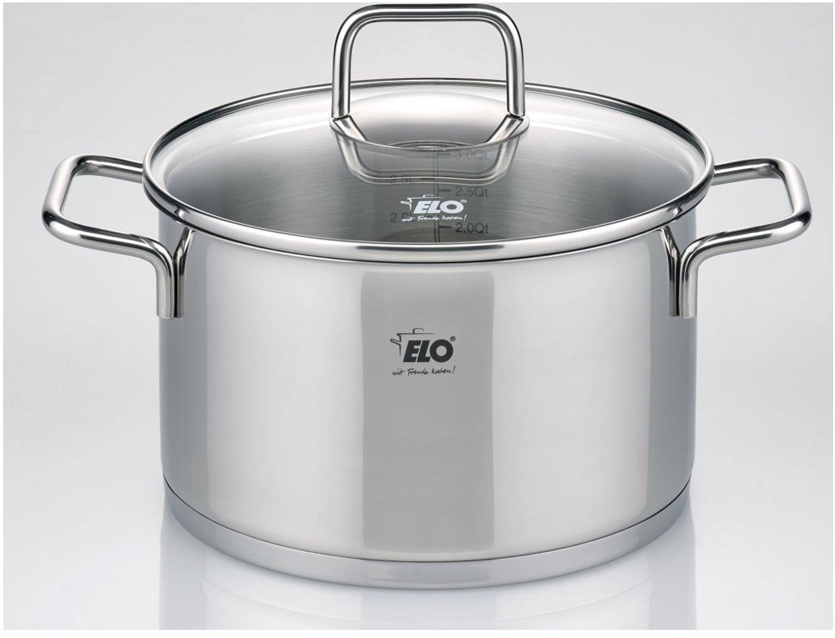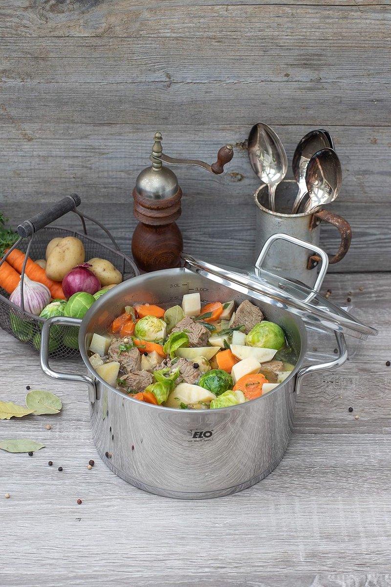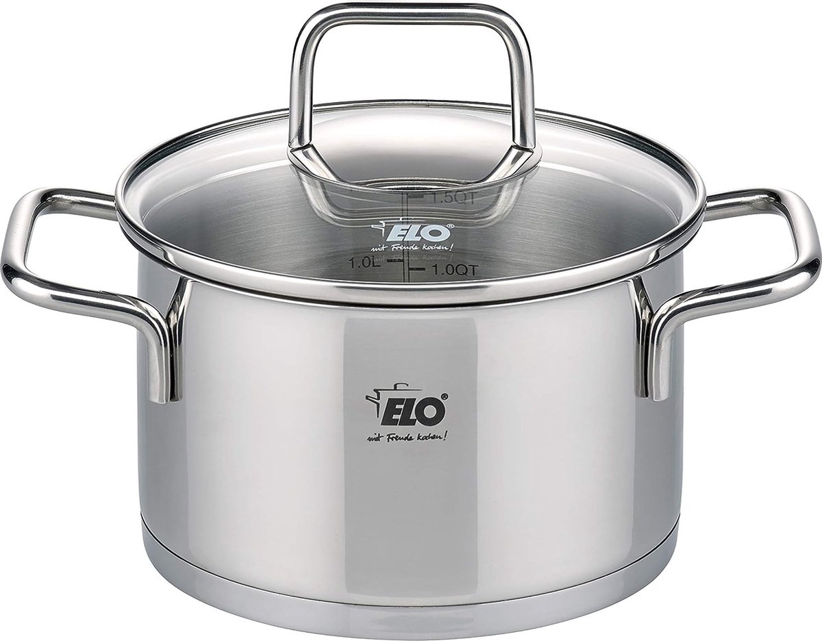 De Elo braadpan is gemaakt van roestvrij staal met een glazen deksel. Roestvrij staal biedt een neutrale kookoppervlakte die geen coatings heeft die kunnen slijten; dat maakt de pan robuust en geschikt voor intensief gebruik. Het glazen deksel laat je het kookproces volgen zonder warmte te verliezen.