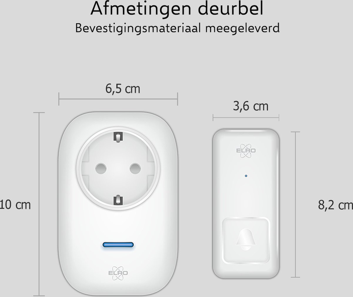 ELRO levert de drukker en ontvanger al gekoppeld in de doos. Je hoeft dus enkel de drukker te activeren en de ontvanger in een stopcontact te steken. Met de meegeleverde kleefstrips monteer je zonder boren; wil je een permanentere oplossing, dan gebruik je de schroefjes. Deze “plug-and-play”-aanpak maakt het product aantrekkelijk voor wie geen technisch wonder is of gewoon snel klaar wil zijn.