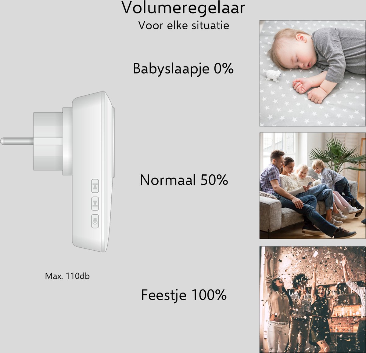 Praktijkvoorbeeld: zet het volume overdag op een middelhoge stand en kies een scherpere toon die door achtergrondgeluid snijdt. ‘s Avonds of tijdens middagdutjes kun je terug naar een lagere stand, of gebruik je extra de visuele LED-indicatie om toch geen bezoek te missen.