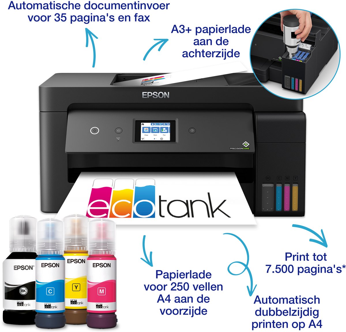Overzicht:De Epson EcoTank ET-15000 is een A3+ multifunctionele inkttankprinter voor Nederlandse thuiskantoren, die de inktkosten gemiddeld tot 90% verlaagt. Met een papierlade voor 250 vellen en A3-printen via de achterste invoer krijgt u grootformaatresultaten zonder inktpatronen. Inclusief meegeleverde inktflessen voor tot drie jaar printen.