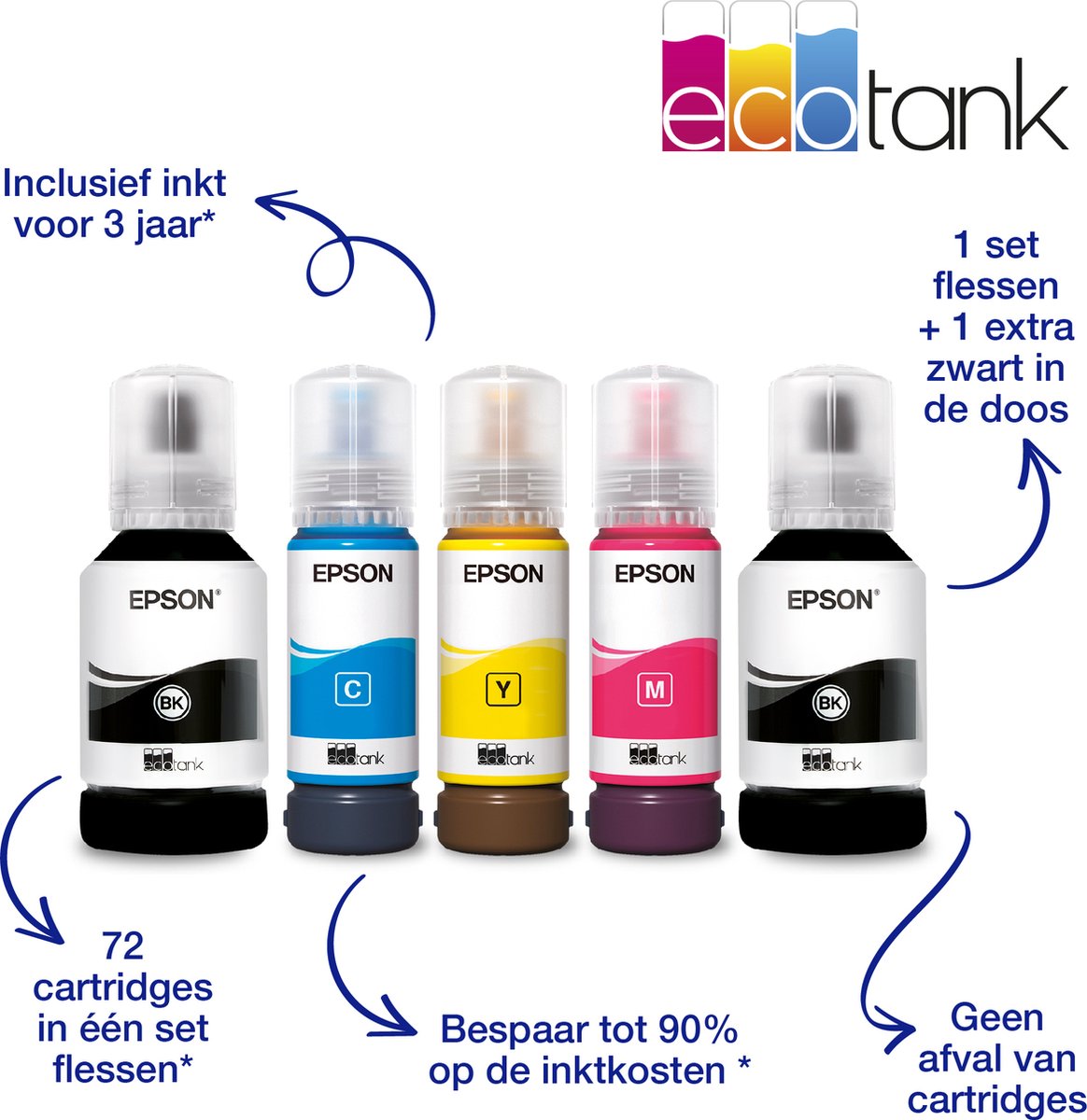 De overstap naar navulbare tanks is de grootste winst van de EcoTank-serie. Je vult de reservoirs rechtstreeks met inktflessen; de doppen zijn voorzien van een kleurcodering en mechanische sleutel zodat elke fles alleen op de juiste tank past. In de praktijk betekent dit: veel minder afval, geen stapels lege cartridges en zelden bijvullen. Dat maakt printen goedkoper en zorgelozer, zeker in huishoudens waar meerdere gezinsleden de printer gebruiken.