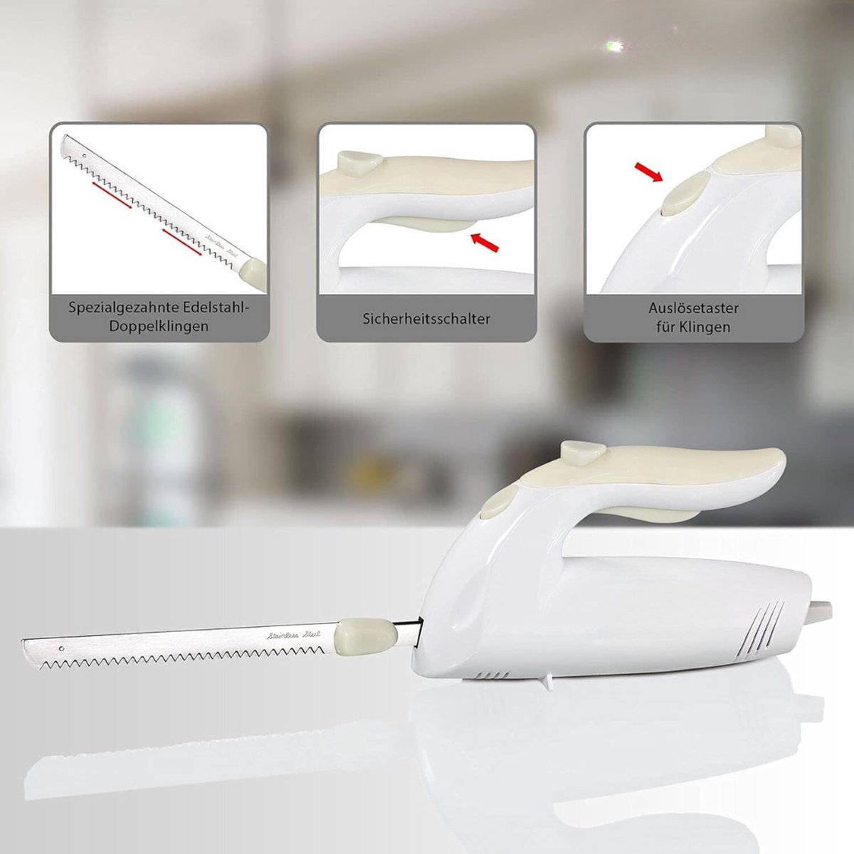 Dit elektrisch mes is de snelle keukenhulp voor drukke Nederlandse huishoudens die tijd willen besparen. Met een krachtige 150 W motor snijd je moeiteloos brood, braadstukken, cake, döner en gyros.