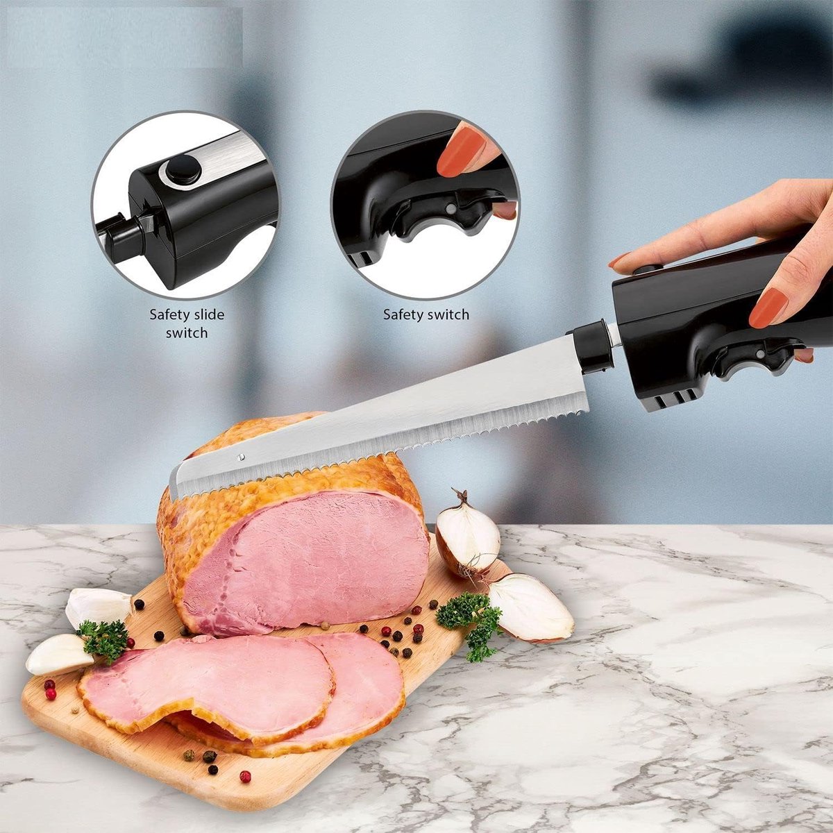 De handgreep is vormgegeven voor controle en stabiliteit. Hoewel exacte afmetingen en gewicht niet zijn vermeld, voelt dit soort elektrisch keukengereedschap doorgaans lichter dan een hakmachine en zwaarder dan een standaard broodmes—precies wat je wilt voor gecontroleerd, recht snijden. De behuizing is zodanig dat je hand tijdens gebruik hoger ligt dan het snijvlak, wat je pols ontspant en je zicht op het snijgoed vergroot.
