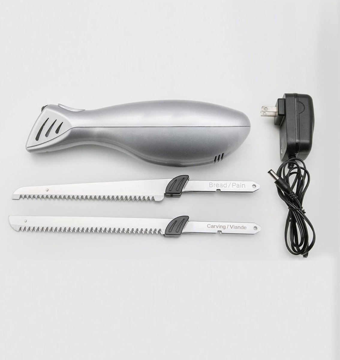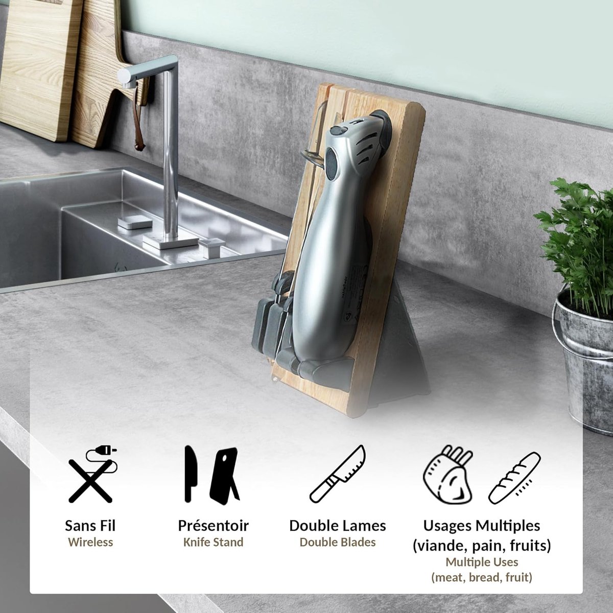 Dit is een draadloos elektrisch mes dat het snijden van brood, cake, vlees, braden, fruit en zelfs diepvriesproducten snel en gelijkmatig maakt. Het apparaat combineert twee verwisselbare roestvrijstalen messen, een oplaadbare 7,4 V lithiumbatterij en een stevige opbergstandaard voor op het aanrecht. Het is bedoeld voor iedereen die tijd wil besparen in de keuken zonder in te leveren op netheid of controle.