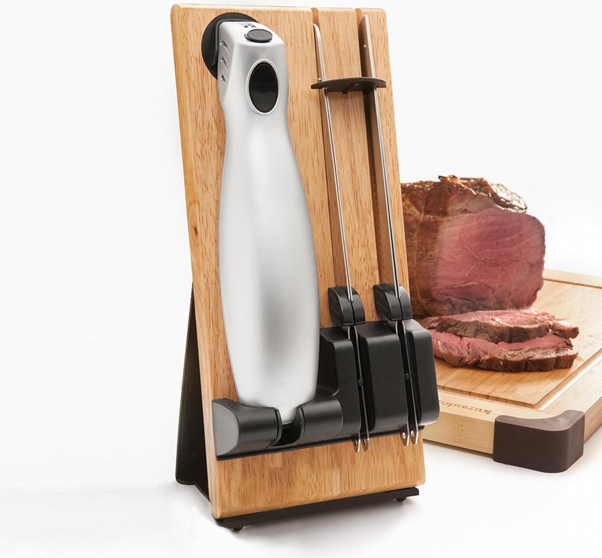 Voor wie regelmatig grotere hoeveelheden snijdt of vaak wisselt tussen zachte en harde producten, is dit een opvallend praktische keuze. De combinatie van draadloos gemak, twee messensets en een compacte standaard maakt het een handig hulpmiddel voor zowel doordeweekse maaltijden als feestelijke momenten.