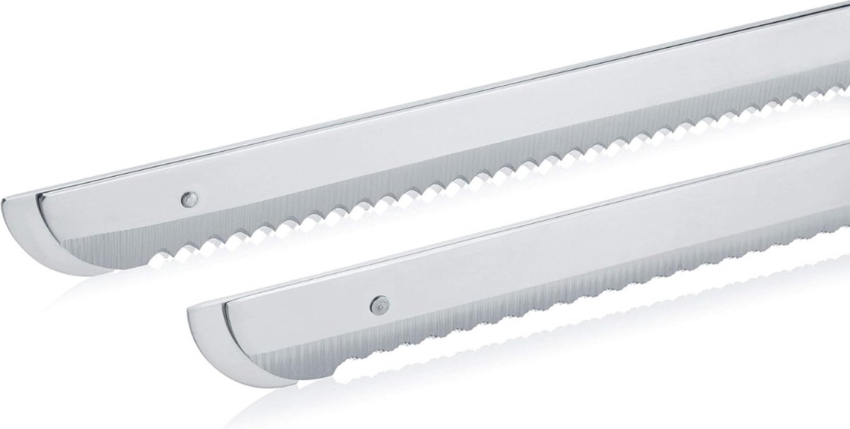 Afmetingen en gewicht worden niet vermeld. Dat is een detail om in gedachten te houden als je beperkte opbergruimte hebt of specifieke eisen stelt aan gewichtsbalans. Desondanks kun je, juist door het eenvoudige ontwerp, uitgaan van een handzaam formaat dat prettig manoeuvreert rond brood, cake en gangbare stukken vlees. Wie compact wil opbergen: er zit geen opslagoplossing in de doos; reserveer dus een veilige plek in een lade of op een ophangrail waar de bladen beschermd blijven.