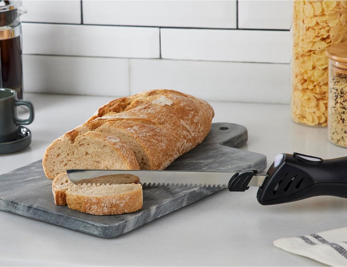 • Brood: snijd gelijkmatige plakken voor toast of beleg, zonder dat zachte binnenkruim wordt samengedrukt. Als elektrisch broodmes gebruik je bijna geen kracht; laat de messen het werk doen.