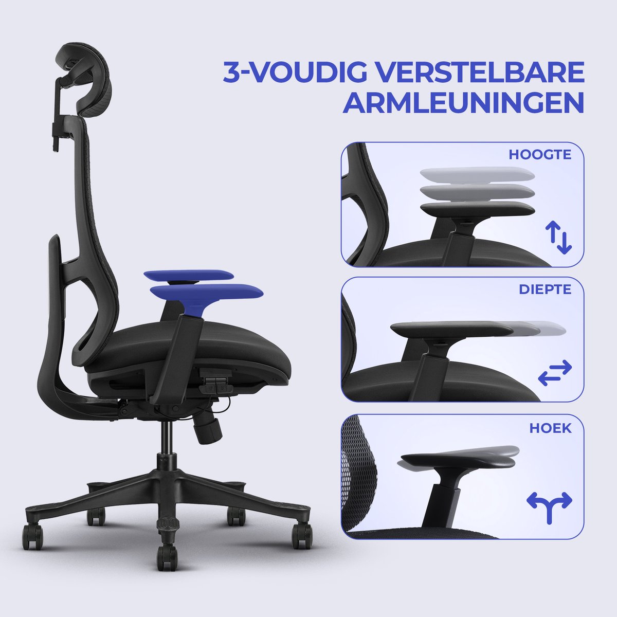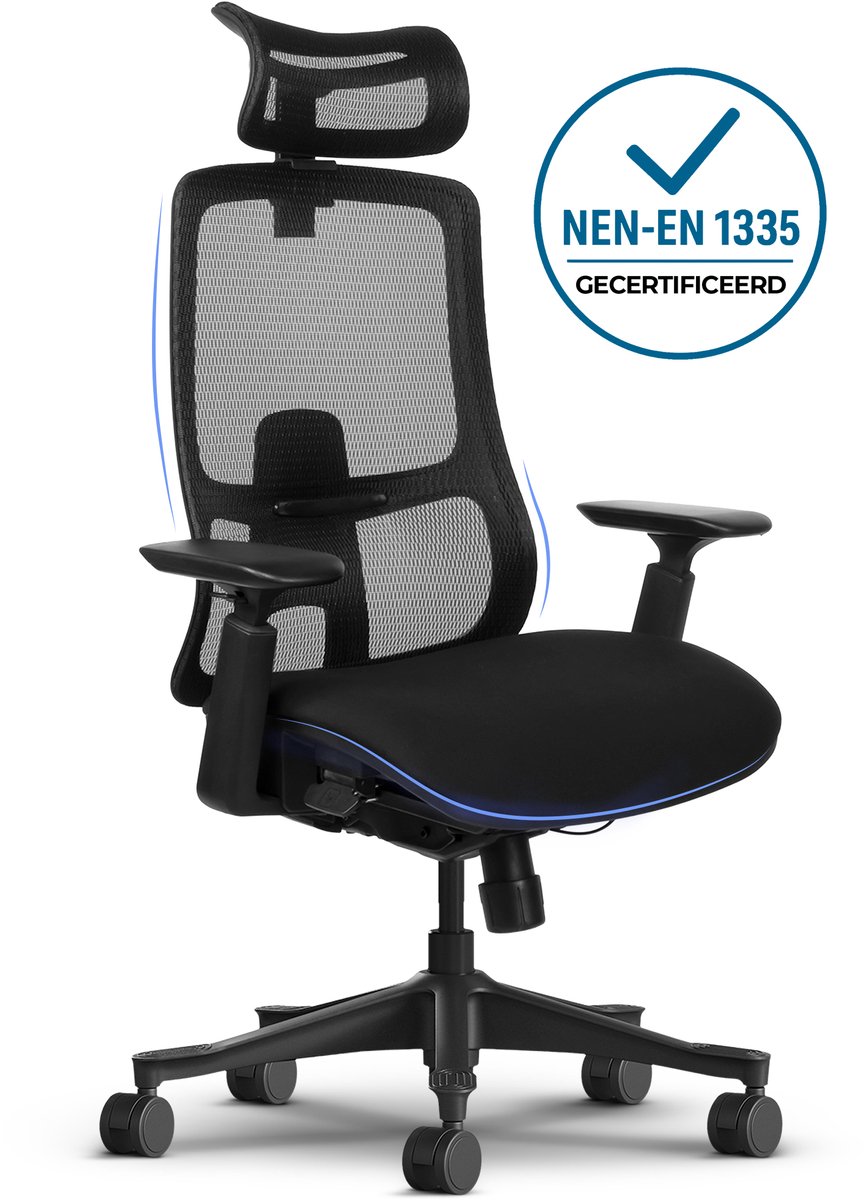 - Pas jouw werkhouding aan — verstelbare lendensteun en armleuningen