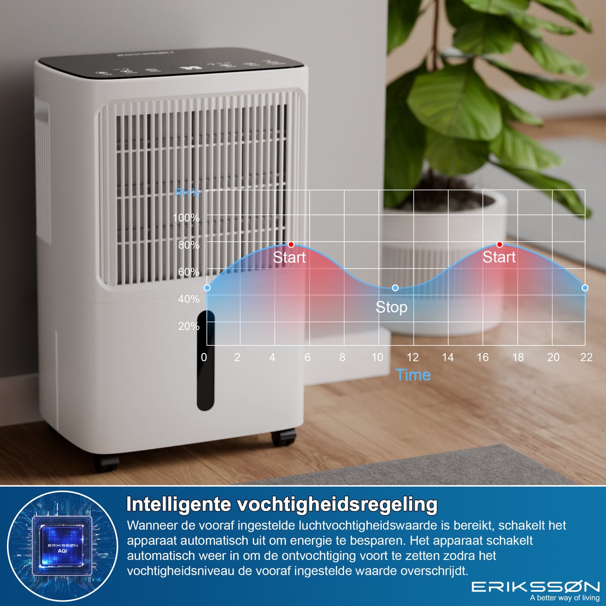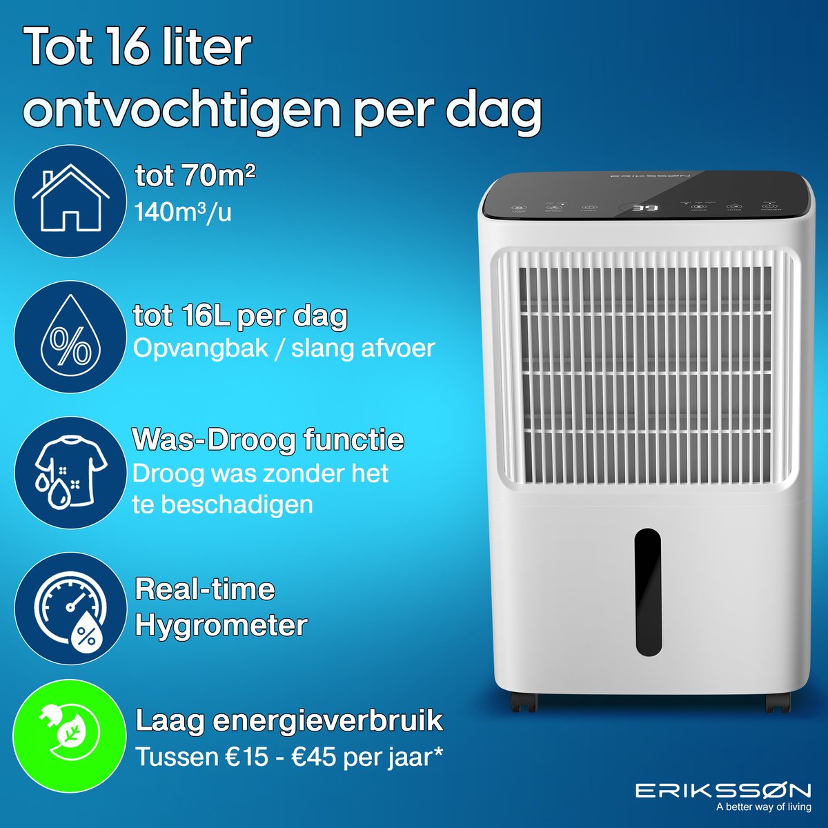 Overzicht:De Erikssøn Luchtontvochtiger Dry Pro Plus is een compacte ontvochtiger voor Nederlandse woningen, ideaal om vochtproblemen en muffe geurtjes te bestrijden. Hij ontvochtigt tot 16 liter per dag en is geschikt voor ruimtes van 20–70 m².