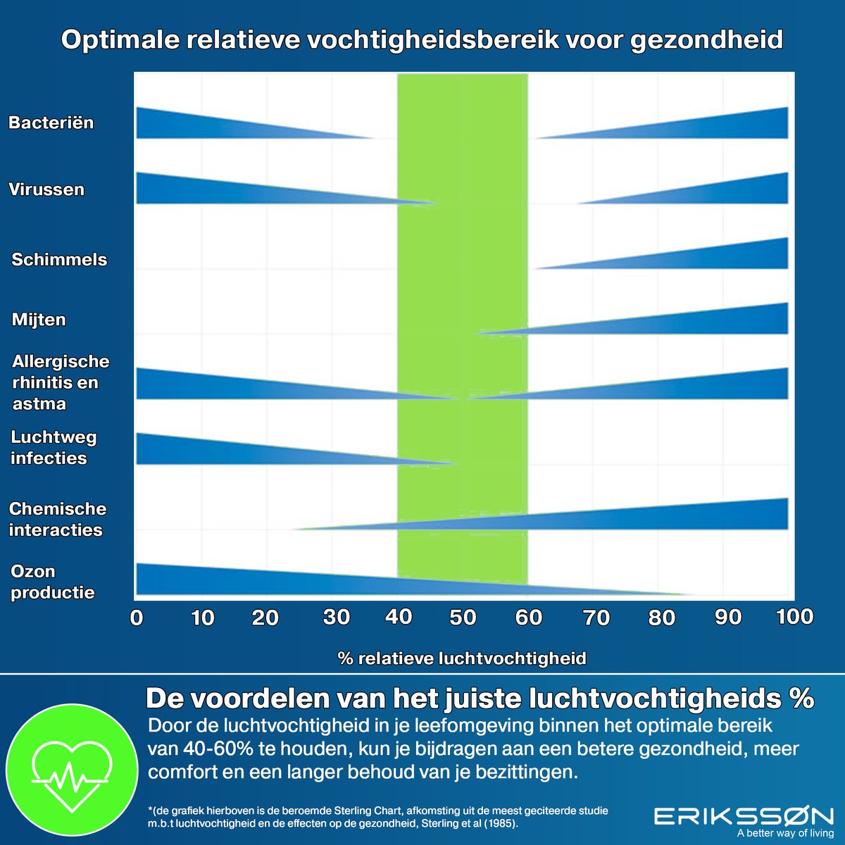 Lage luchtvochtigheid (onder 60%) kreeg ik niet voor elkaar door lang te ventileren (ramen open), wat je in de winter toch niet wilt. Met deze ontvochtiger is een jarenlang probleem met condens opgelost — en dat ondanks een woning met energielabel A en HR++-beglazing. Een paar collega’s met hetzelfde probleem zijn inmiddels ook enthousiast. Het haalt geen 16 liter per dag, maar per apparaat halen we ruim 1,8 liter per dag uit de lucht.