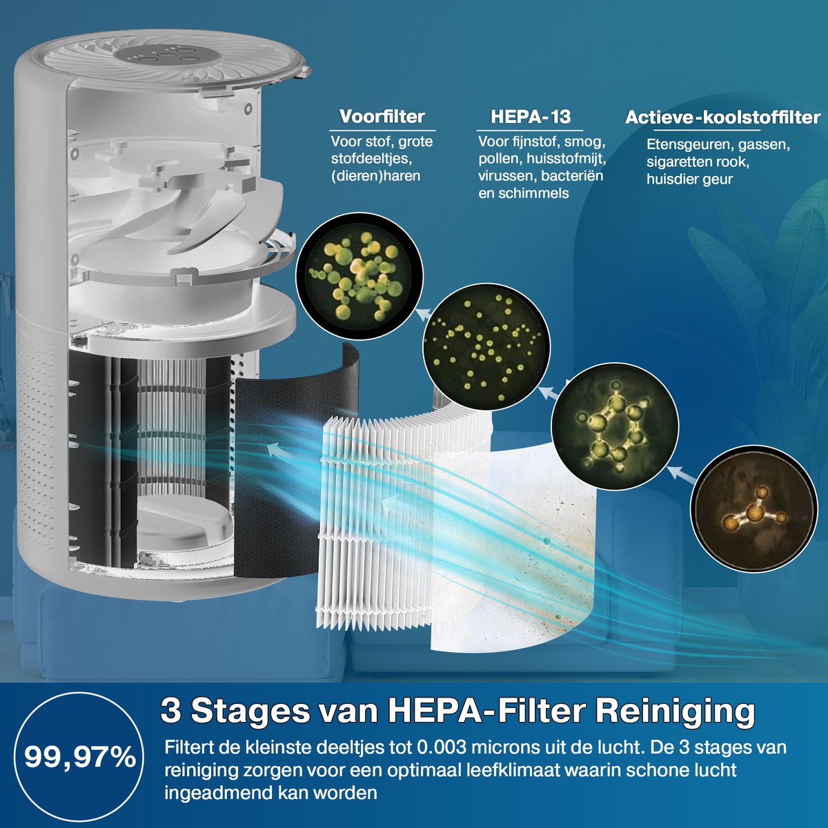 De Air Pure Prime werkt met een meerstaps filteropbouw: een pre-filter vangt grove deeltjes zoals haren en zichtbare stof, dubbele activated carbon (actieve koolstof) reduceert geurtjes en kookluchtjes, en er is een fijnfiltertrap voor de kleine deeltjes. Volgens de producttekst filtert de HEPA-trap 99,97% van microdeeltjes tot 0,1 μm (bron: listing, checked 2025). Let op: in de producttekst wordt gesproken over een HEPA-13 filter, terwijl de specificaties “HEPA 14 filter: Ja” tonen — raadpleeg de verkoper als exacte classificatie cruciaal is voor je keuze.