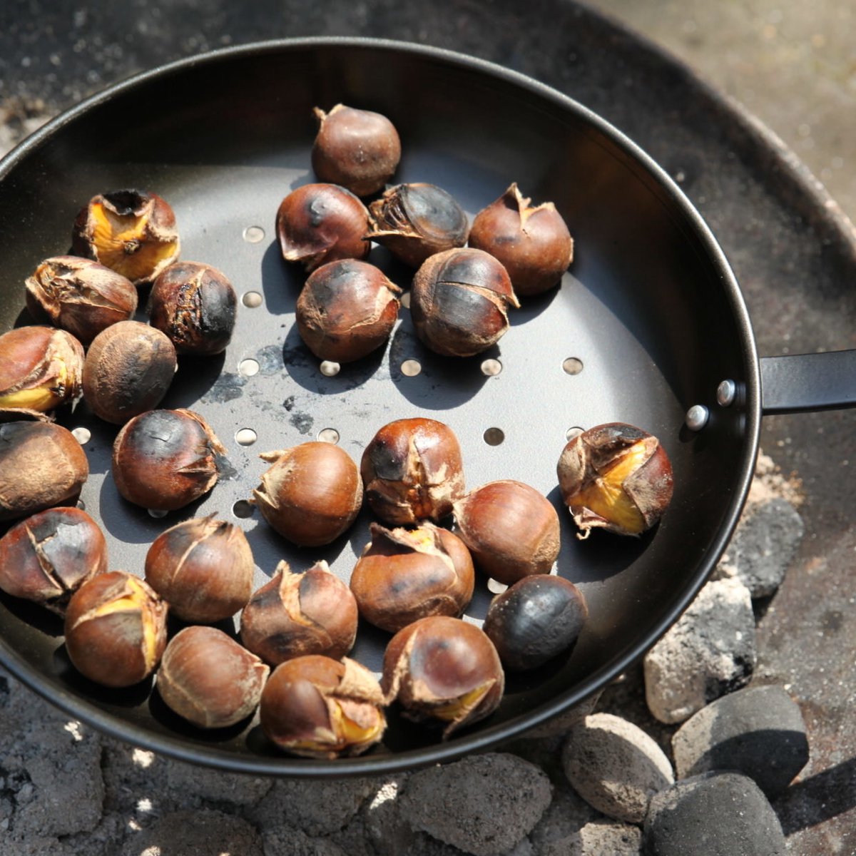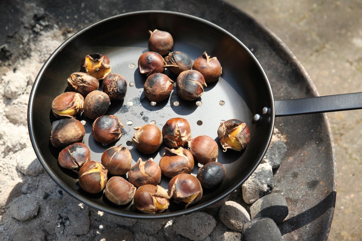 - Roosteren: schud of roer regelmatig zodat alle kastanjes gelijkmatig garen. Door de lange steel kun je dit veilig vanaf een afstand doen.