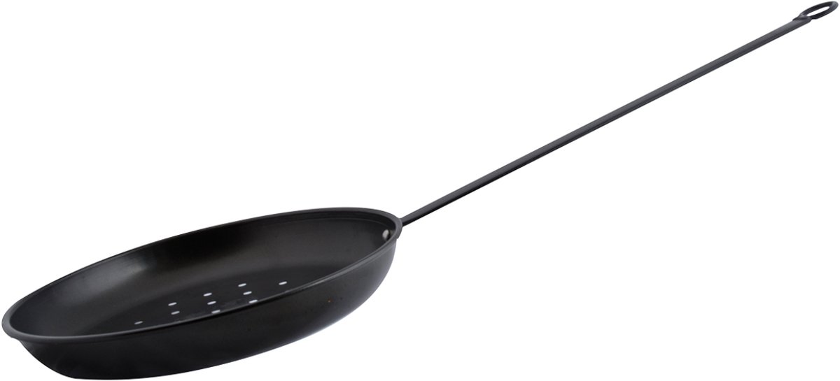 Overzicht:De gietijzeren kastanjepan met lange steel is ideaal voor Nederlandse thuiskoks die traditionele, gelijkmatig geroosterde kastanjes willen bereiden. Met afmetingen 78 x Ø27 x 8,6 cm biedt deze pan voldoende lengte en diepte voor veilige bediening en royale porties.