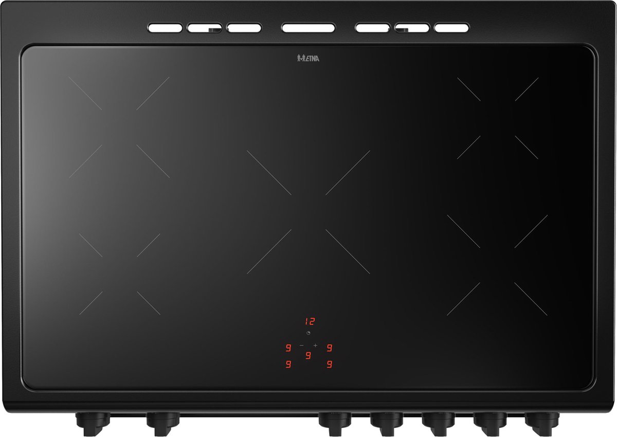 De ETNA FI590ZWA is een 90 centimeter breed inductiefornuis met vijf kookzones en een grote elektrische oven. Het combineert een moderne inductiekookplaat met klassieke draaiknoppen, en dat voelt direct vertrouwd aan. Met een royale oveninhoud van 105 liter en 5 insteekniveaus is dit fornuis duidelijk gericht op gezinnen en thuiskoks die graag veel en gevarieerd koken.
